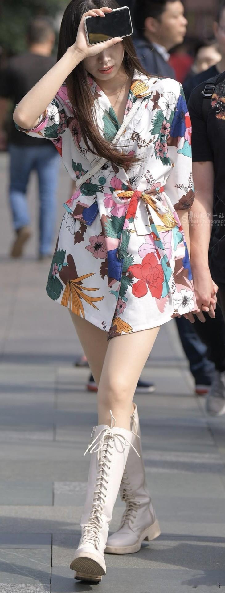 印花收腰衬衫裙搭配白色系带长靴,色彩鲜艳又显腿长,日常出街这样穿,清爽又有活力。