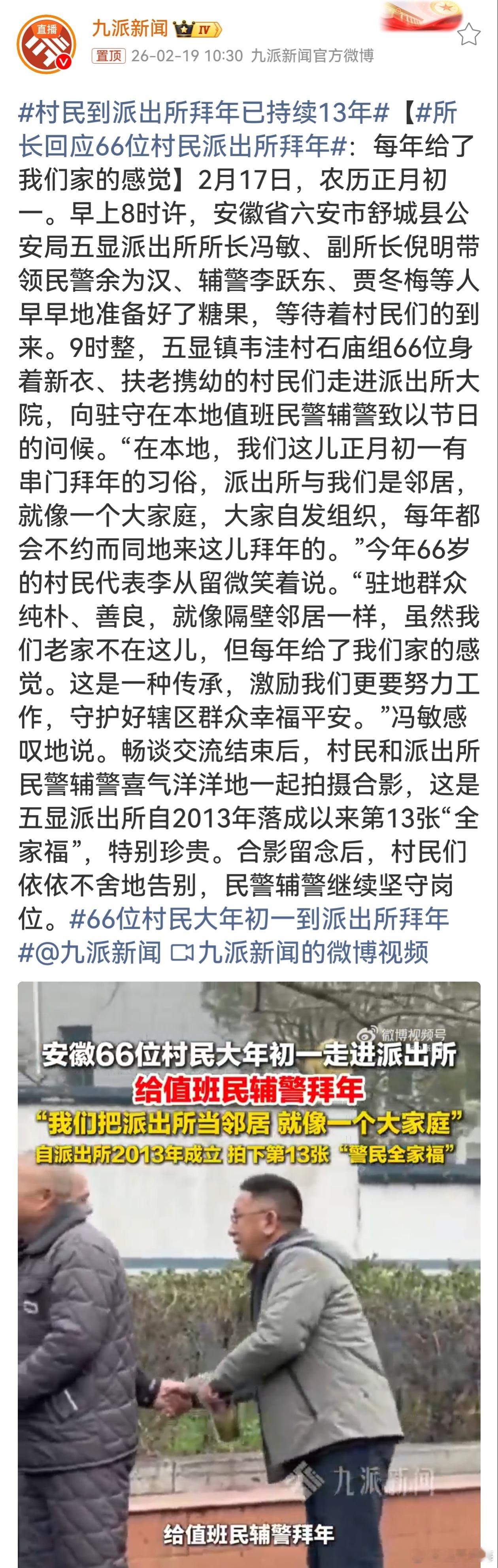 村民到派出所拜年已持续13年66位村民连续13年大年初一到派出所拜年,如同家人相聚。这不仅是风俗传承,更体现警民间深厚情谊。村民的感恩之举温暖民警,民警也定将这份激励化作动力,继续守护一方平安,这种警民和谐令人赞叹。