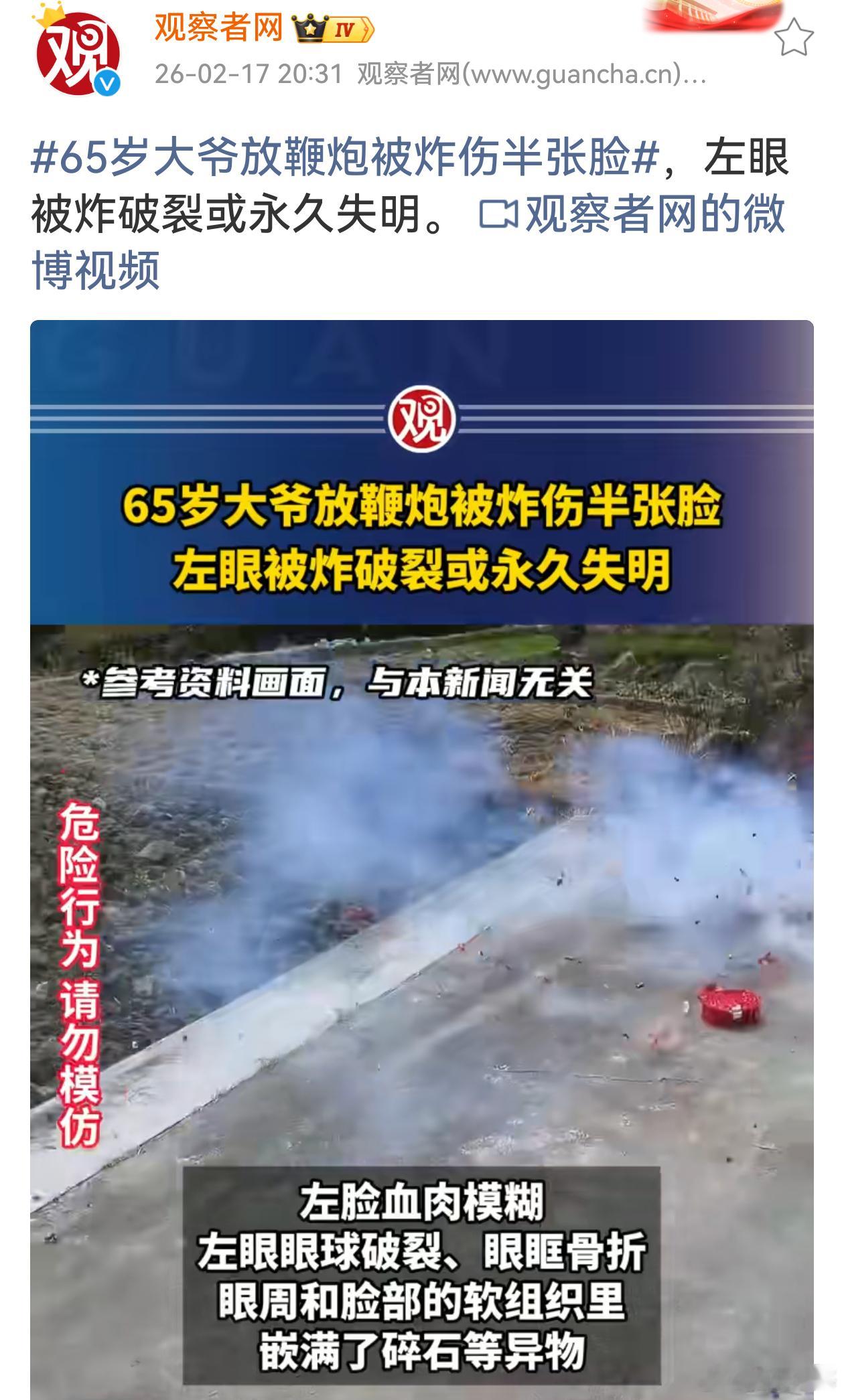 65岁大爷放鞭炮被炸伤半张脸放鞭炮本为添喜庆,65岁大爷却因此半张脸被炸伤、左眼或永久失明,安全意识不可缺,燃放鞭炮需谨慎!