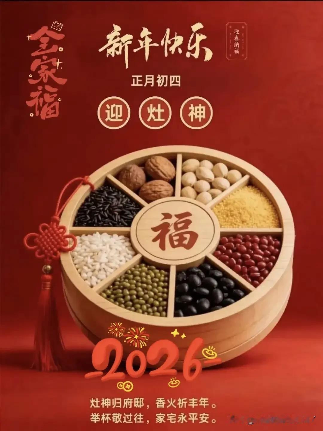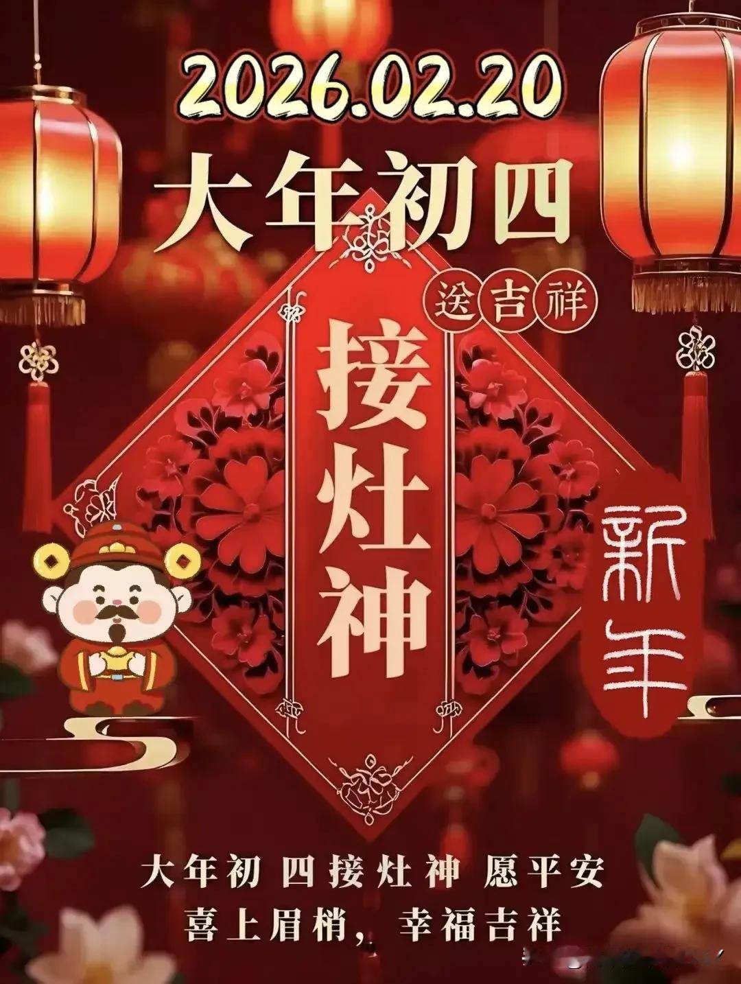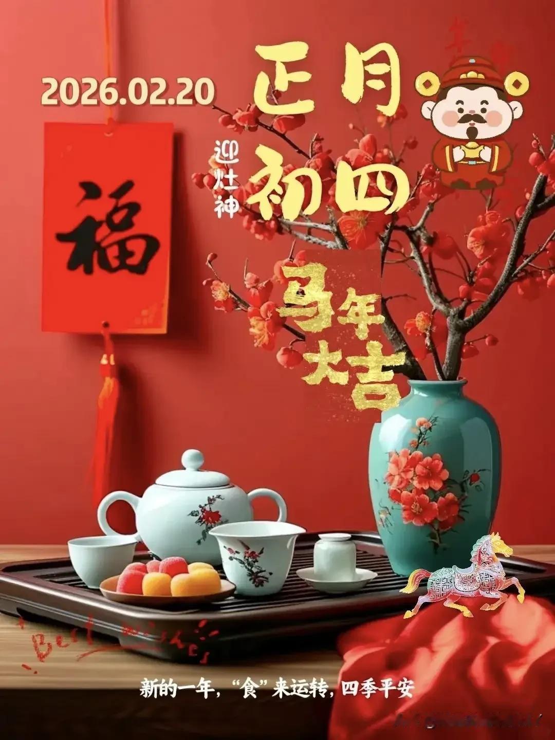 大年初四,接神纳祥,四季皆安福满堂。 大年初四,日子过得正热闹,老辈人说这是个要“接神纳祥”的好日子。清晨的鞭炮声刚落,家家户户就忙着迎灶王爷回家。 灶台上摆上刚蒸的馒头,香炉里插三炷新香,老人对着灶台念叨几句,盼着新一年锅里有米、灶上有温,一家老小吃嘛嘛香。 门外的红纸上,“五路财神”四个字透着喜气。有人早早备好糖果糕点,敞开大门等着财神进门,嘴里说着“金银满罐”,眼里的笑藏不住。 这可不是贪心,是盼着日子能像炭火一样,旺得持久。院子里扫帚动起来,过年攒下的垃圾要清出去。老话说这叫“扔穷”,扫出去的是尘土,留下来的是福气。 孩子们追着垃圾车跑,像是在赶晦气,笑声比鞭炮还响。其实这一天的讲究,说到底都是盼头。盼灶王爷多说好话,盼财神爷多送实惠,盼扫走旧年的磕绊,迎来新年的顺顺当当。 你看那街头巷尾,有人提着礼盒走亲戚,有人在家贴新福字,连空气里都飘着甜丝丝的盼头。就像老辈人常说的,日子是过出来的,福气是盼出来的。 大年初四,把心放宽了,把劲鼓足了。愿你新一年里,遇着懂你的人,干着顺手的事,家里常热闹,兜里不缺钱。就像那刚上鞍的马,一抬脚就是顺风路,马到功成,福满门庭。