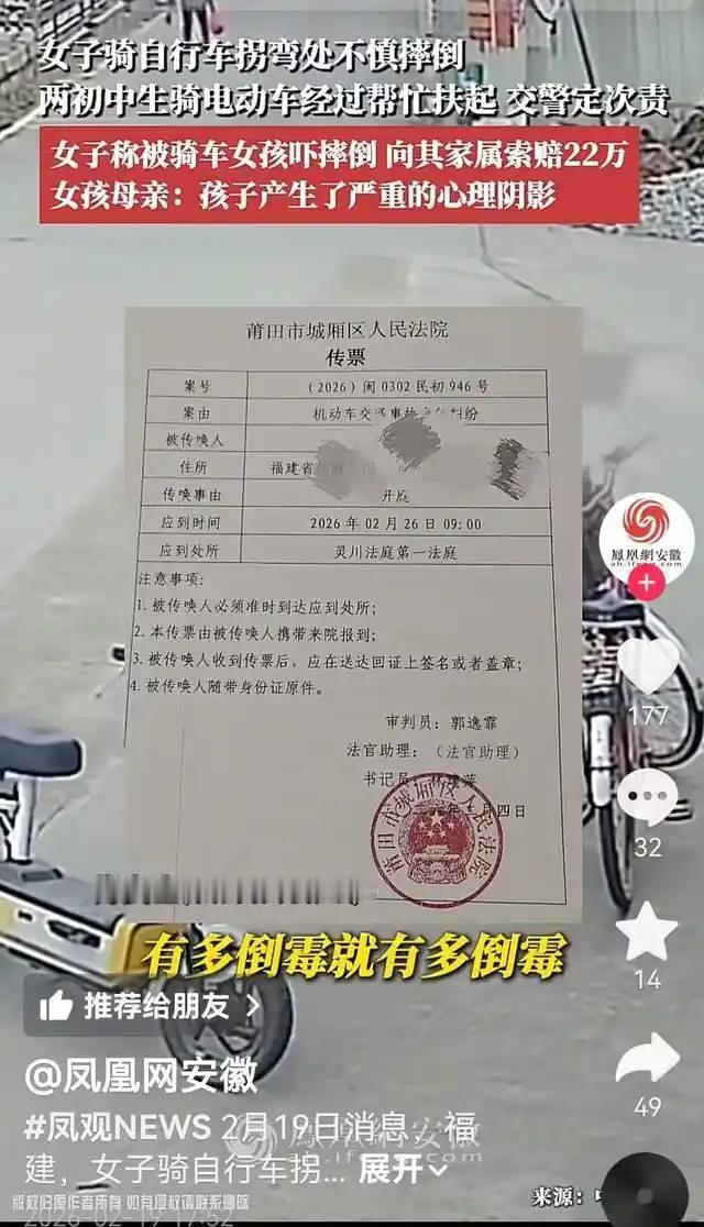 老太骑车摔倒,初中生好心扶起反被起诉索赔22万,这事儿还是不要和稀泥的好! 这两天看了则新闻,视频内容大概是福建莆田两名初中女生骑电动车路过路口,看到一位老太太骑自行车摔倒在地,稍纠结讨论后就去搀扶。 可到头来这两个孩子却被老太太告上法庭,老太太说是被突如其来的电动车吓到才摔倒的,于是索赔高达22万! 据孩子妈妈郑女士说,自从出了这事儿,女儿变得小心翼翼、沉默寡言,甚至对“扶人”这件事留下了严重的心理阴影。 我隔着屏幕都能共情到这位家长的委屈与无助,也能想象到,这起官司会给两个未成年孩子的价值观可能带来的影响。 我从头到尾反复看了好几次视频内容,只讲自己看到的事实。 根据曝光的监控画面,事发时,一辆白色轿车刚从前面的路口快速经过,老太太骑自行车在拐弯处行驶时,身体出现向右倾斜的趋势,接着重心不稳,几乎同步右侧出现了骑电动车的女生。 眼看就要摔倒时,两名初中女生骑着电动车也从侧向驶了过来,看到老人即将倒地,两人短暂犹豫后,还是主动上前将老人扶起。 老太太摔倒后被送往医院,住院治疗12天,花费了26700元医疗费。随后,老太太一方就一纸诉状,将两名初中生告上了法庭,索要包括医疗费、护理费、营养费、精神损害抚慰金在内的22万赔偿。 而交警部门经过调查后,判定两名骑电动车的女生承担事故次责,理由是她们的电动车存在逆行行为,虽然没有与老太太发生直接碰撞,但老人的摔倒,与看到逆行电动车后惊慌失措、采取急刹措施有关。 网上有人痛骂老太太“恩将仇报”“狮子大开口”,好心扶你还要被讹,寒了全天下好人的心; 也有人理性分析,说女孩逆行确实是交通违法,虽然扶人值得肯定,但违法就要承担相应责任,不能因为善意就抵消过错; 还有人感慨,这又是一起“扶不扶”的难题,从当年的彭宇案,到如今的初中生扶人被索赔,我们的社会善意,正在被一次次类似的事件慢慢消耗。 谈谈我的想法。我并不否认,两名初中生骑电动车逆行,确实违反了《道路交通安全法》,这是不争的事实。 交通规则面前人人平等,不管是成年人还是未成年人,不管出发点是好是坏,只要违反了规则,就应该承担相应的责任。 但问题的关键在于,责任归责任,善意归善意,我们不能因为女孩有逆行的过错,就否定她们扶人的善意。 我查了相关法律规定,《民法典》第一百八十四条明确规定,因自愿实施紧急救助行为造成受助人损害的,救助人不承担民事责任。 这就是我们常说的“好人条款”,出台这条法律的初衷,就是为了打消好人的顾虑,鼓励见义勇为,不让“英雄流血又流泪”。 虽然这起事件中,女孩的逆行行为存在过错,但她们的扶人行为,依然属于自愿紧急救助,理应受到法律的保护。 让人无法接受的是,老太太一方索要22万的赔偿,实在是离谱至极,完全超出了合理范围。 要知道,老人的医疗费总共才26700元,就算加上护理费、营养费等其他费用,结合女孩仅承担次责的认定,最终的赔偿金额也绝不可能达到22万。 这种狮子大开口的索赔,难免让人怀疑,其目的并非单纯的维权,而是借着“受伤”的名义,想趁机讹一笔钱。 类似的事件一次次上演,带来的危害远比我们想象的更大。它不仅让当事人承受了巨大的经济压力和精神煎熬,更在无形中给整个社会植入了一种“戒备性冷漠。 不是人心变冷了,不是大家不想做好事了,而是好人被伤害怕了,大家都怕“扶人反被讹”,怕自己的善意,最终变成别人谋取利益的工具。 经过类似这样的事,以后还会有多少人以后再看到别人有困难,还敢勇敢地伸出援手吗?还有多少未成年人,会因为这件事,被浇灭心中的善意之火? 女孩逆行纵然有责任,但一定要给她们的善意留有余地;我们可以支持老人依法维权,但一定要守住维权的边界,不能借维权之名,行讹诈之实。 希望这世界上的每一个好人,都能被世界温柔相拥。