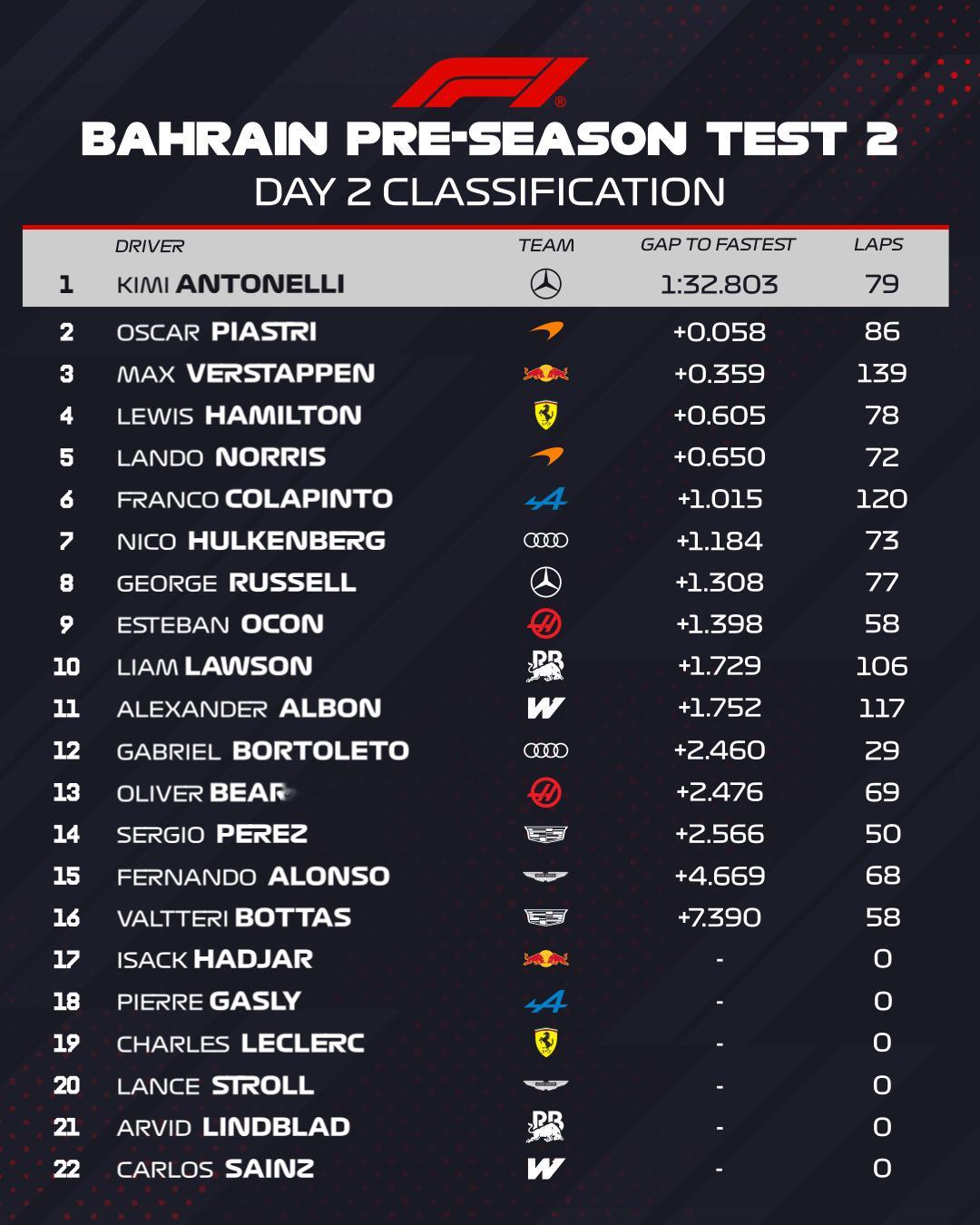 第二天安东内利在F1巴林季前测试的第二天创造最快圈速,并且是巴林5天测试以来的最快圈。完整成绩榜单和圈数请见图二。