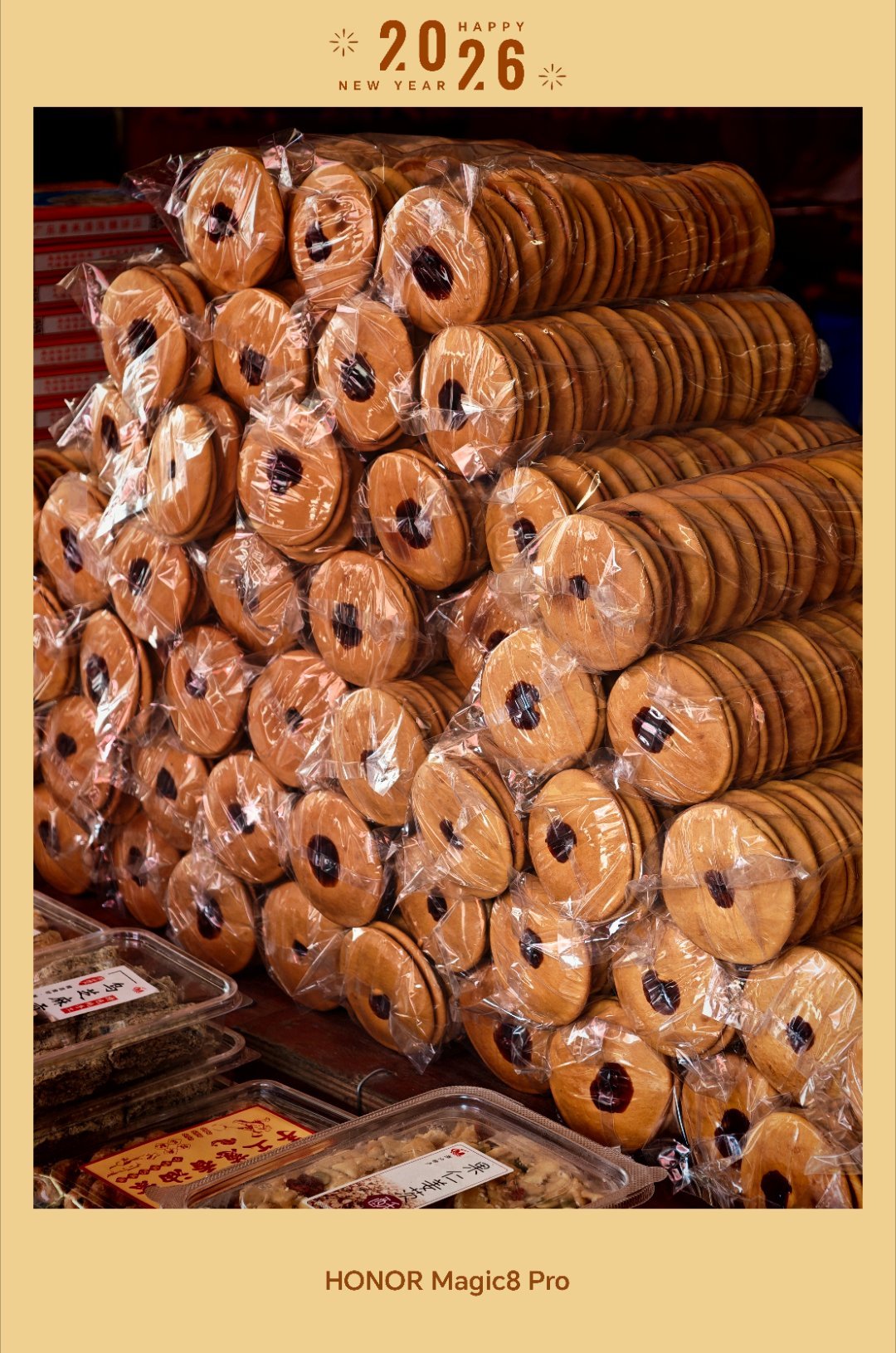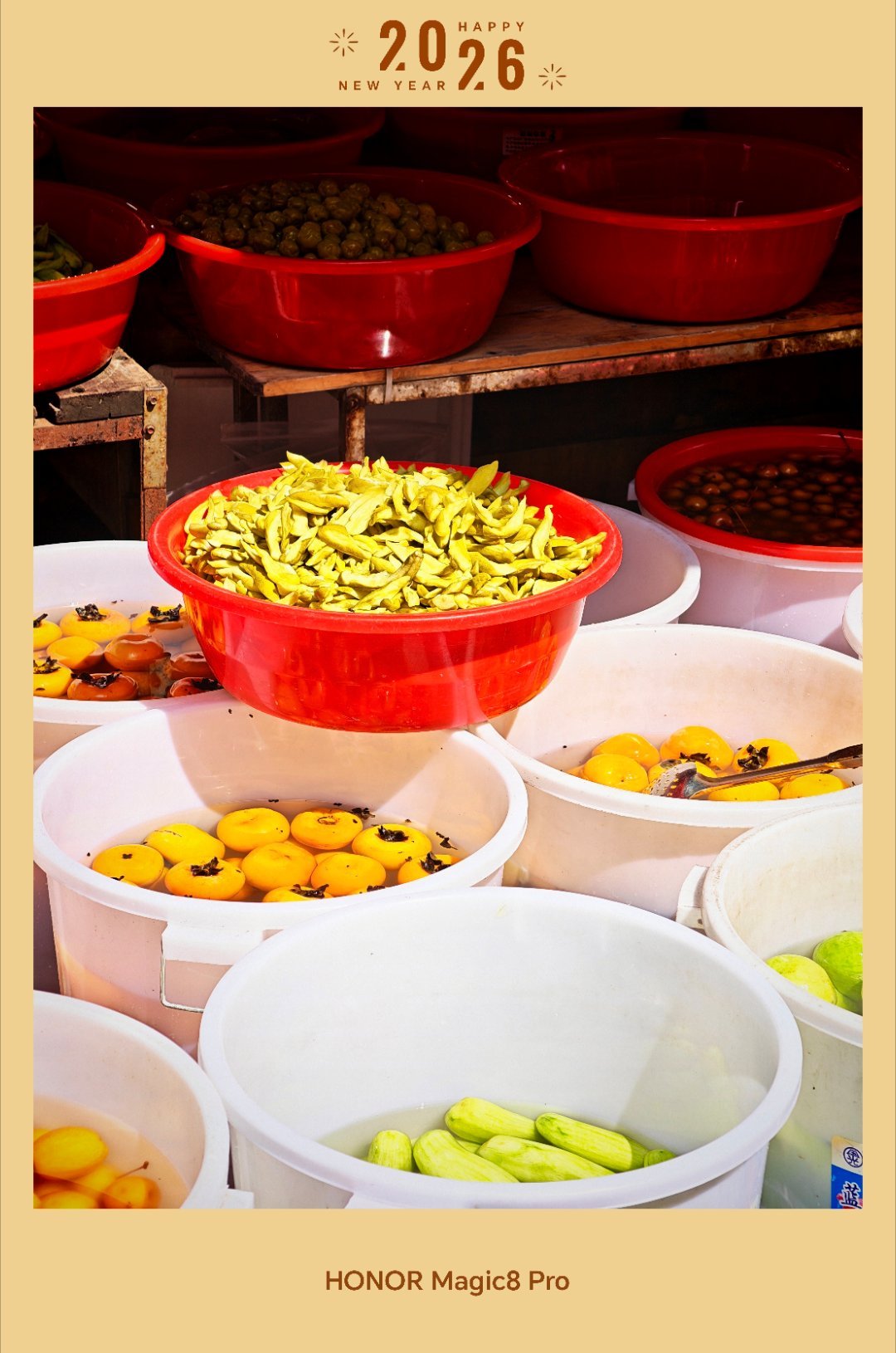 来上一些春节随手拍。坐标:惠来隆江。除了猪脚饭,还有绿豆饼。还有腌制的,水果?一桶一桶的泡在水里,好像也是这边的特色,好多。📱 shot on HONOR.春节摄影大赛