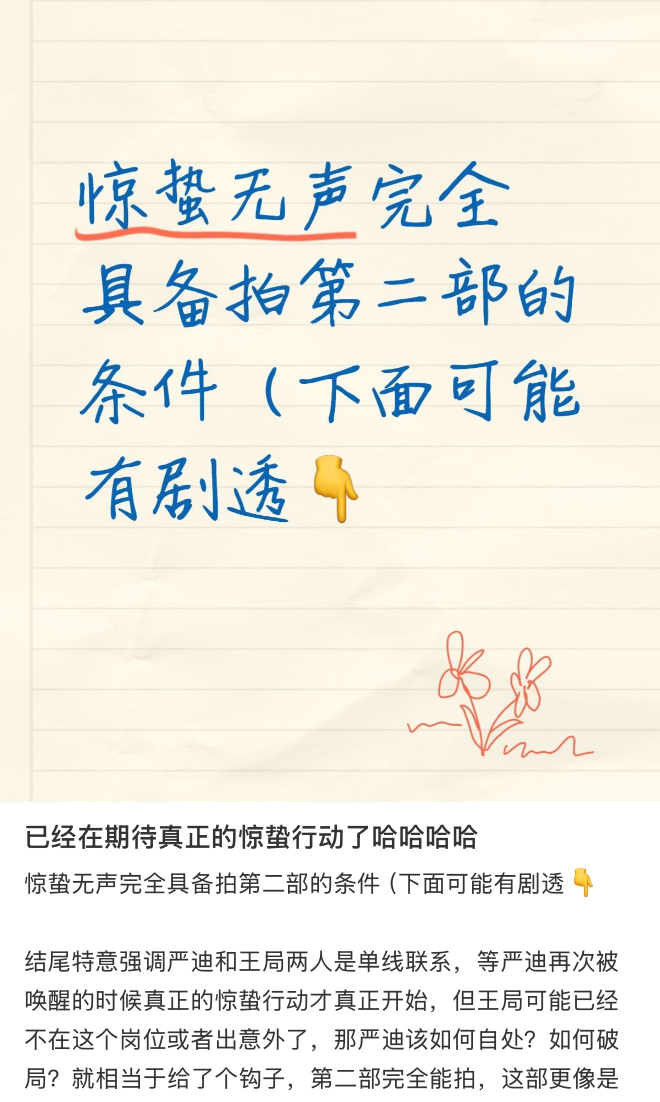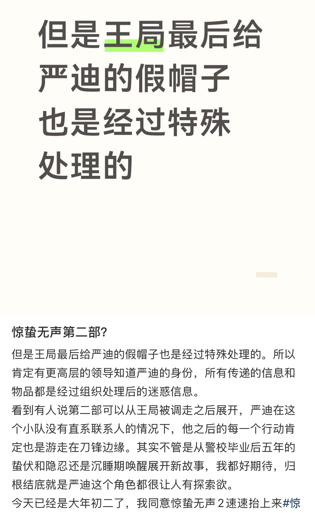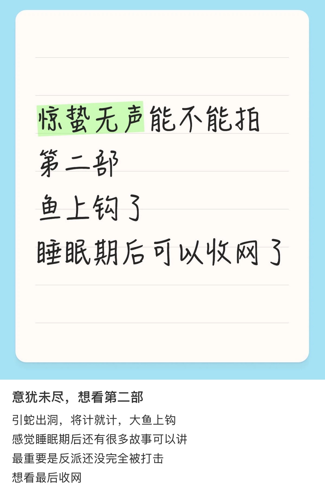 想看惊蛰无声第二部看完《惊蛰无声》,心里一直没缓过来,很期待能有第二部。特别想看严迪怎么在正反双方之间周旋,想看正方内部高层里有没有被策反的人,想看镜外势力和国 安之间的技术较量,也想看张译那个角色不在之后,严迪要怎么证明自己的身份。