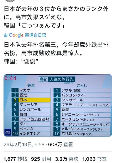 原来日本也有“公知”,这条帖子在日本有600万观看,3.2万点赞。 其实,这事儿可不是空穴来风,今年中国春节长假长达9天,被媒体称为“史上最长春节假期”,出境游热潮再度升温,国家移民管理局推算,春节期间日均出入境人数超205万人次,较去年增长14.1%。 可问题在于,以往常年稳居中国春节出境游热门榜单前列的日本,今年却意外“翻车”,直接跌出了前十,而一直紧随其后的韩国,却一路逆袭登顶,成了中国游客春节出境游的首选目的地。 不过,最让日本“公知”破防的不是被反超,而是韩国方面的态度,韩国旅游部门相关人士公开表态,隐晦对日本说了声“谢谢”,言外之意很明显,感谢日本“让位”,接住了大量中国游客。 殊不知,这位日本“公知”在帖子里吐槽不断,大概意思就是,日本明明风景好、服务优,为何中国游客偏偏不买账,反倒扎堆去韩国,言语间满是不解和抱怨,活脱脱一副“受害者”模样。 更关键的是,这篇帖子下方的评论也吵翻了天,有日本网友附和吐槽,也有清醒的日本网友直言不讳,说出了问题的关键,并非中国游客偏心,而是日本自身有太多硬伤。 与此同时,日媒《产经新闻》也发文感慨,质疑“春节中国人还来旅游吗”,文中提到,今年春节中日航线预订虽接近去年水平,但中国游客的选择明显转向了东南亚和韩国等风险感知较低的地区。 不过,反观韩国,今年可是下足了功夫,不仅简化中国游客签证流程,还在热门景区布置中国红装饰、安排中文服务,就连商家都纷纷推出春节专属优惠,全方位讨好中国游客。 无独有偶,往年春节,日本也是中国游客的热门选择,东京池袋、大阪药妆店都会挂起春节横幅,可今年却明显冷清,不少日本商家直言,少了中国游客,生意淡了一大截。 更离谱的是,那位日本“公知”还在帖子里暗戳戳甩锅,暗示中国游客“偏心”,却压根不提日本近期在旅游服务、入境政策上的敷衍,也不提地区政治氛围带来的影响。 深一层看,日本被韩国反超,根本不是偶然,而是必然。随着中国游客消费越来越理性,不仅看风景和服务,更看重目的地的友好度和便捷性,韩国的逆袭,全是靠实打实的努力。 殊不知,日本这些年在春节旅游市场上越来越不上心,不仅没有针对性的优惠和服务,还时不时出现一些让中国游客不适的举动,慢慢就被中国游客抛弃,被韩国反超也在意料之中。 说到底,韩国反超日本,从来不是运气,而是用心换来的结果;日本跌出前十,也不是中国游客偏心,而是自身不够重视。那位日本“公知”的破防,不过是不愿接受现实的自我感动罢了。 以上是小编个人看法,如果您也认同,麻烦点赞支持!有更好的见解也欢迎在评论区留言,方便大家一同探讨。