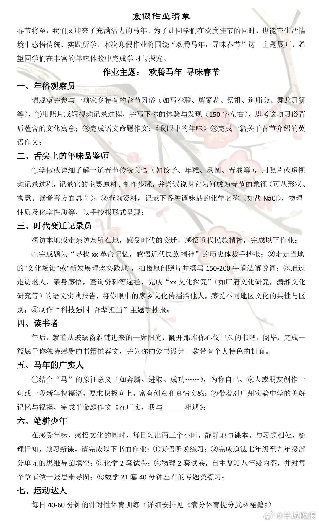 #寒假作业#春节 大年初四,寒假过半,要准备赶寒假作业了?广州实验中学给不同年级的同学都写了一封公开信。对于初二少年,学校说:无需急赴前路,只管沉下心感受此刻的留白与可能。对于初三同学,学校三两絮叨:阅读、嬉戏、与家人围坐,每日学习两三小时。