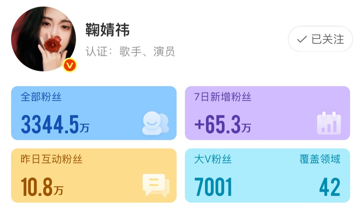 鞠婧祎7日涨粉65.3万昨日访问量540万+真的佩服她强大的吸粉和固粉能力❗️