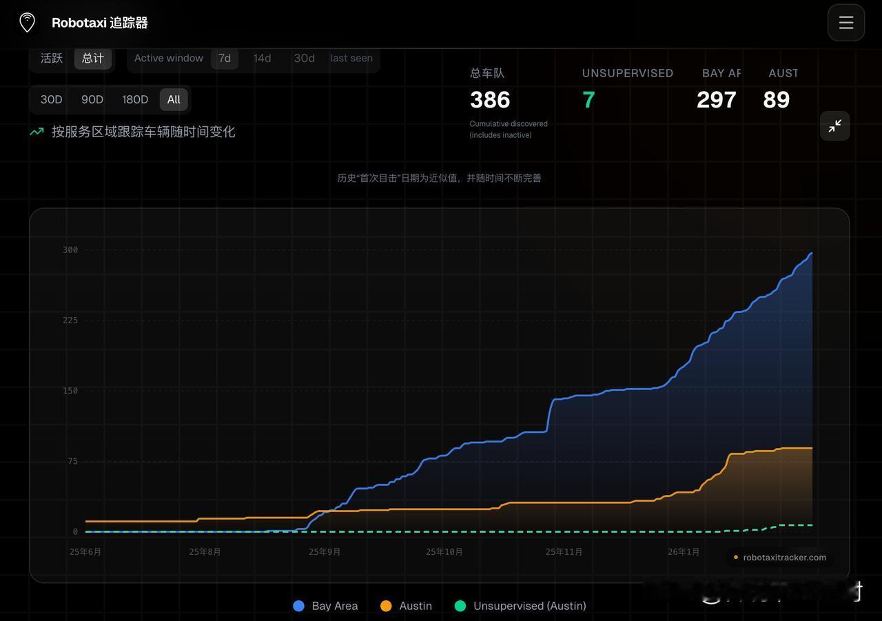 这个数据蛮有意思。 由第三方统计的,特斯拉目前在运营的Robotaxi车队数量约为386台。 其中,Bay area(湾区)占了绝对多数,而且增长比较稳定,已经接近300台; Austin约有90台左右。 前段时间热炒的、备受关注的无安全员Robotaxi车辆依然非常非常少,仅有7台,看起来依旧处于很小规模的探索阶段。 与对手Waymo相比,数量上的差距依然巨大(Waymo最近的披露车队规模3000台左右)。 目前特斯拉的Robotaxi基本都是由model Y来运营,专为Robotaxi而设计打造的Cybercab前几天已经官宣第一台量产下线,按照马斯克之前说的,预计会在4月份开启规模生产,看看到时候Robotaxi车队规模会不会迎来想象中的指数级提升…… 目前看起来,硬件应该不再是瓶颈,关键还是在于FSD的进度。