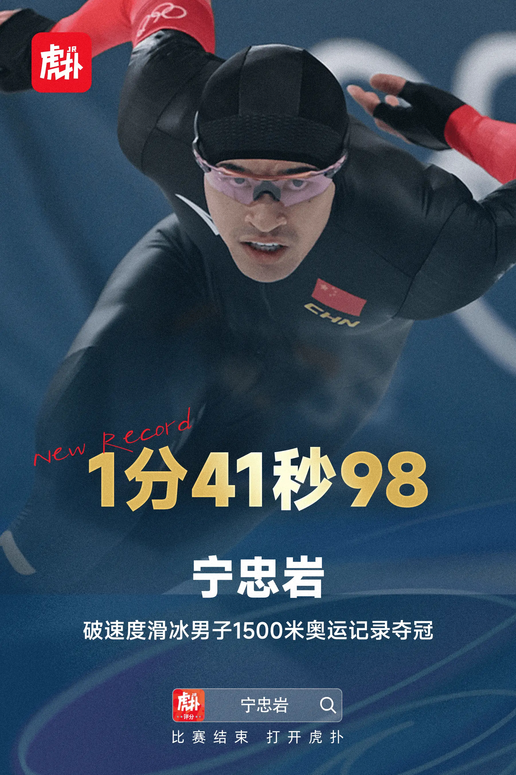 速度滑冰男子1500米决赛,第13组出发的中国选手宁忠岩滑出1:41.98成绩,打破奥运会纪录,获得金牌。