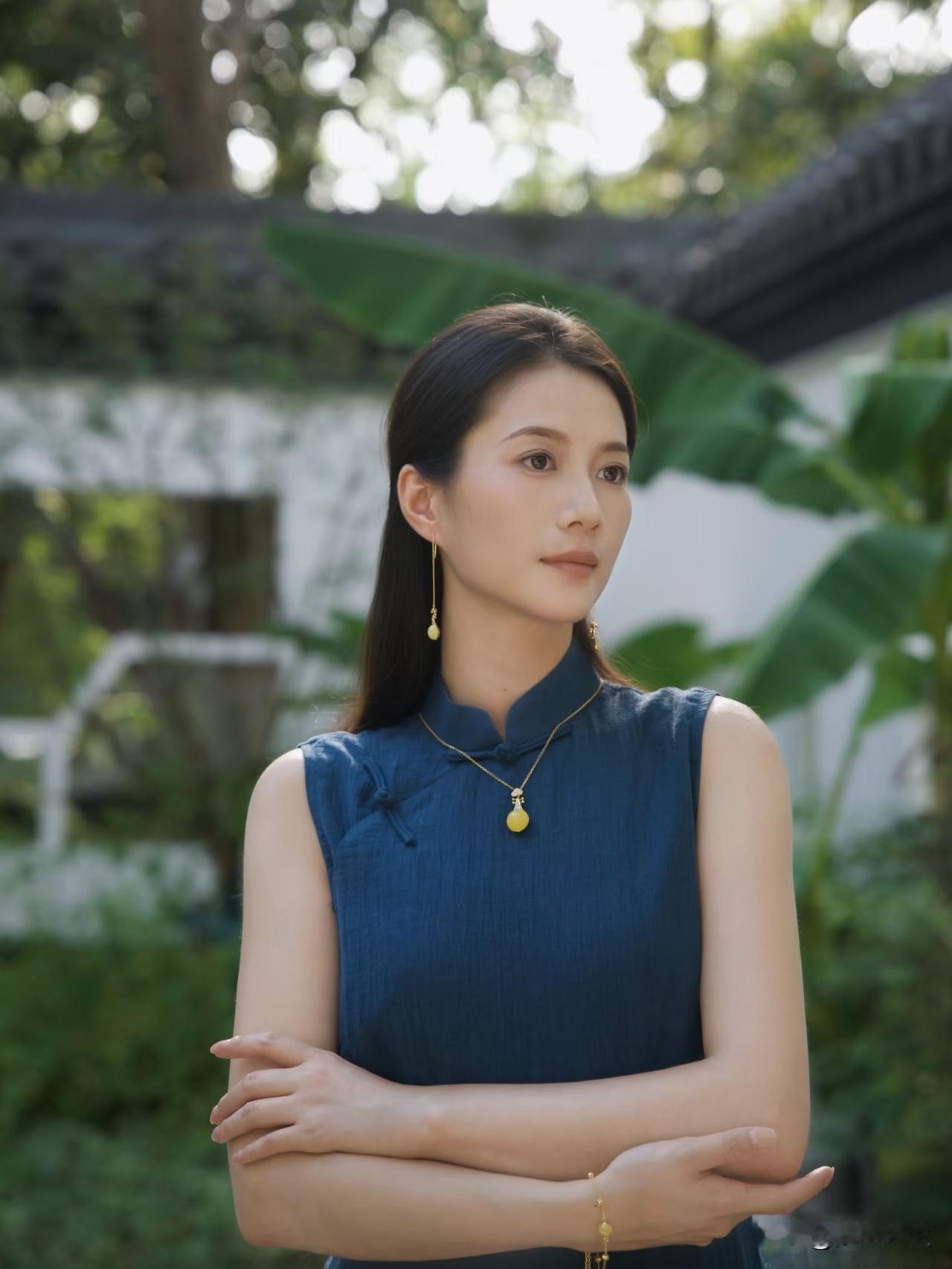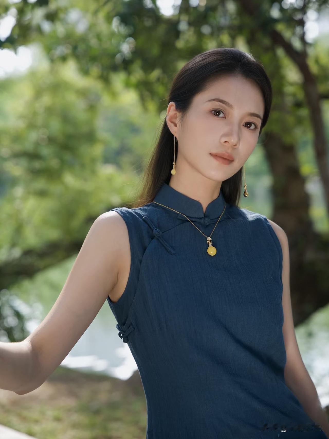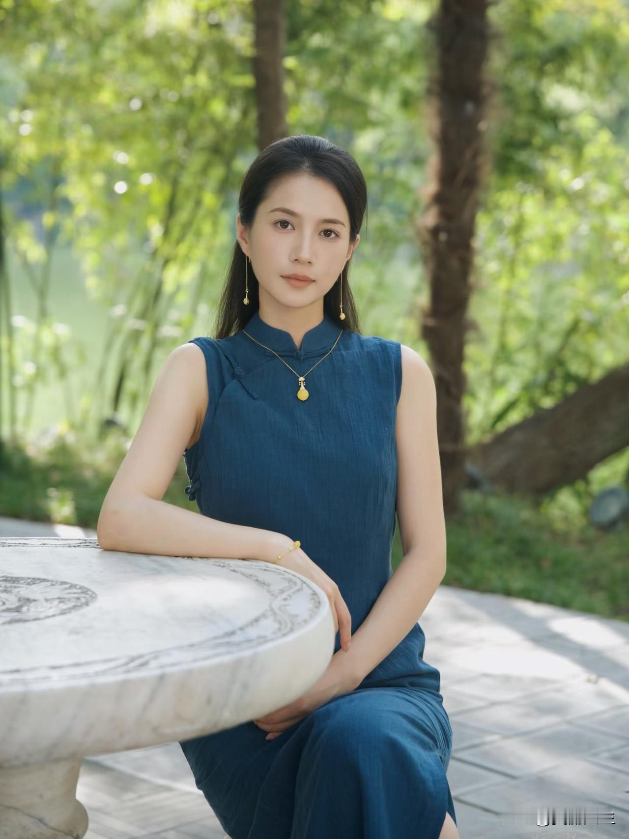 优雅蓝裙,自然妆容,清新自然,美丽人生。