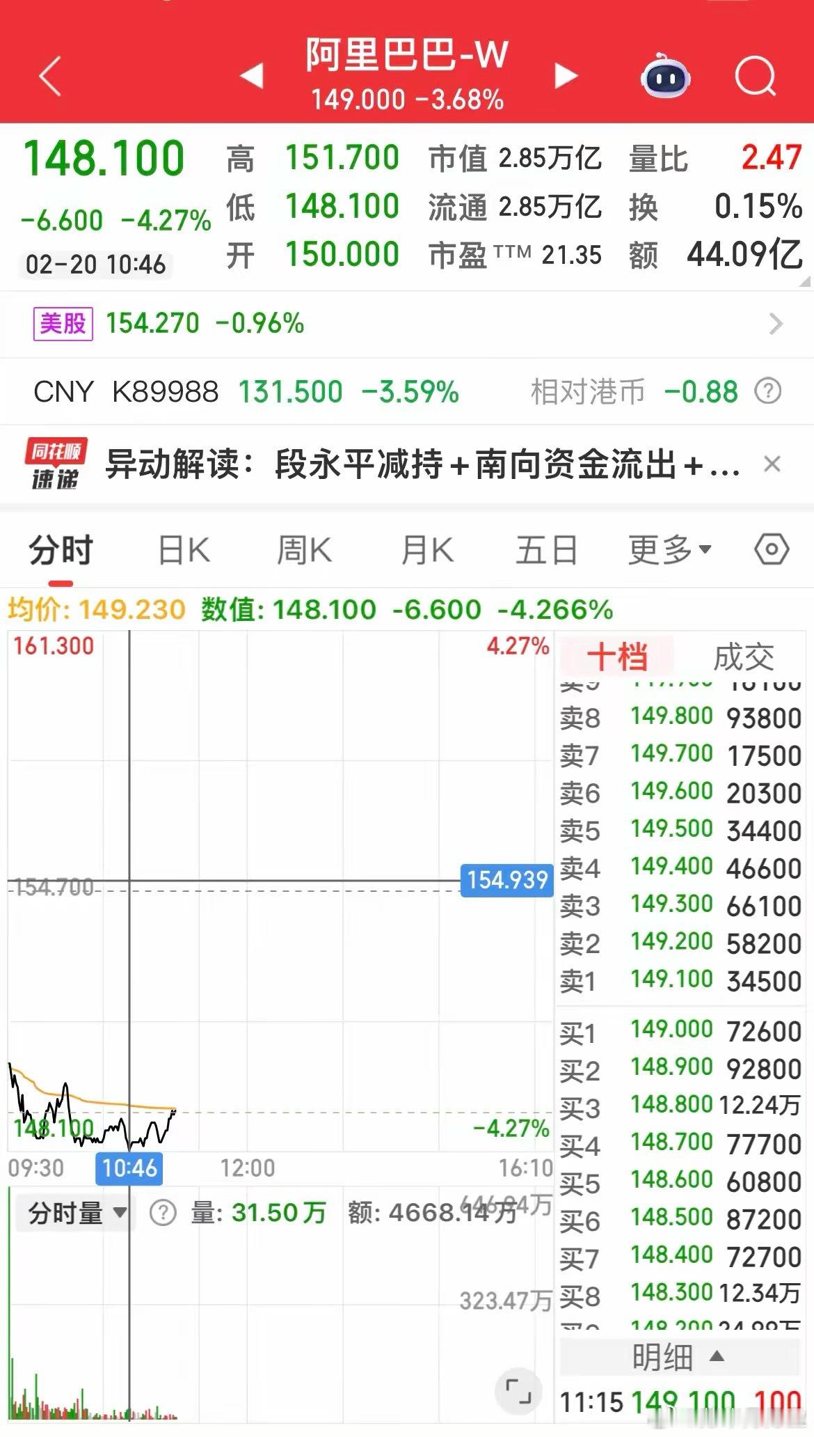 受段永平减持消息的影响,阿里巴巴盘中一度下跌超4%!