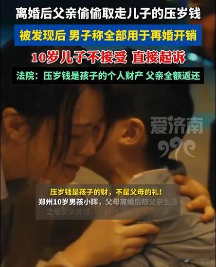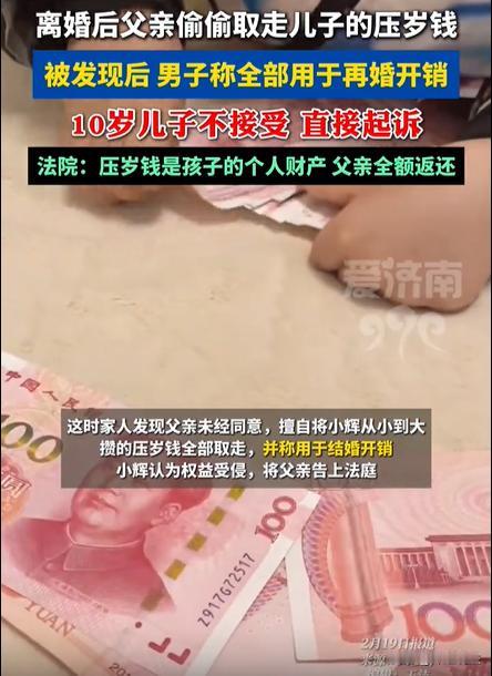 郑州,一男子外面有了女人,就跟自己老婆离婚。离婚之后男子立刻就跟新欢结婚,离谱的是,男子竟然把10岁儿子的压岁钱全都取出来,用在自己的婚礼布置上。前妻跟儿子都崩溃了,儿子表示不接受,“我的压岁钱凭什么给你结婚用?”前妻以儿子的名义,将前夫给上诉了,要求孩子的父亲将8万多压岁钱全部返还。 济南日报·爱济南2月19日报道了这则新闻。 一个男人可以无耻到什么地步?不妨看看这个父亲,真的是自私到极点。 张某跟妻子结婚多年,生育了一个儿子。本来家庭非常美满,谁知道男子竟然在外面有了外心,除了自己的妻子,外面还有个女人。 这件事被妻子发现之后,两个人开始闹矛盾,吵吵闹闹多年,最后张某直接就跟妻子去扯了离婚证。 扯证之后,10岁的儿子小辉判给了妻子,他们母子二人去生活。自此之后,张某对儿子小辉完全就是不管不问。 然而,这位无耻的父亲,竟然前脚刚离婚,后脚就跟新欢准备结婚。 前妻此刻也算是认清了这个男人,自己的前夫,完完全全就是个花心的人。 而张某在张罗自己的婚礼的时候,想到儿子小辉还存着一笔压岁钱,足足有8万多,这个父亲竟然开始动了贼心思。 张某直接就拿着儿子的卡,去银行里将这8万块给取出了出来,全数用在自己的结婚开销上面。 这件事很快就被前妻跟儿子知道了,10岁的儿子小会指出,他无法接受,因为父亲根本就没有经过自己的同意,而且压岁钱就是他自己的。 小辉跟妈妈说,希望她可以帮助自己,去找爸爸把钱款给追回来。毕竟这些钱,都是他从小到大攒起来的压岁钱。 前妻找前夫索要这些压岁钱,因为这些都是儿子的钱,前夫的行为,肯定侵犯到孩子的财产权。 但是前夫却抵赖,说什么压岁钱,都是属于父母的,小孩子要什么钱。 看到前夫如此耍赖,前妻感到很不可理喻,就以儿子小辉的名义,直接就把前夫给上诉了,要求他将小辉的全部压岁钱都退还。 相关部门是如何判定的呢? 经过一番审理认定,压岁钱属于小辉的个人财产,而父亲虽然从小辉小的时候就是监护人,但是他无权擅自处理孩子的财产权。 最后,相关部门判定,张某需要全额返还小辉的压岁钱,还要返还利息,合计82750元。 很多网友说,都已经离婚了,孩子也判给了妈妈,这个爸爸就没有资格再挪用,这应该算是盗窃罪吧。 看看这个爸爸的行为,为了新欢,为了二婚,为讨好对面的女人,对自己的亲生孩子下手,真是既没有道德、还涉嫌违法。 本案释法: 1.父亲隐瞒孩子,趁孩子不注意,取走小孩的银行卡去取钱,父亲的行为是否涉嫌违法呢? 根据《民典法》第三十五条规定,监护人除了维护被监护人的利益外,不得处分被监护人的财产。 这条法律的规定意味着,即使父母是监护人,也不可以随意动用孩子的个人财产,此举已经构成财产侵权,已经违法了。 从案子中的父亲的行为来看,可能还要从民事侵权上升到刑事犯罪。 2,父母可以随意挪用小孩的压岁钱吗? 根据《民典法》第六百五十七条规定,长辈给孩子的压岁钱属于赠与行为,当孩子或者监护人表示接受、钱款完成转移时,所有权即归属孩子。 这条法令意味着,压岁钱并不是家庭的共有财产,也不是父亲所谓的“礼尚往来”的回本工具,而是孩子独立享有的财产权益。 因为孩子还是未成年人,作为父母可以以监护人的身份去保管孩子的钱财,但是父母的“保管权”拥有严格的法律边界。 监护人除了为维护监护人的利益之外,不可以处分被监护人的财产,如果父母私自挪用,孩子成年之后有权依法追回。 正如本案中的小辉,攒下了8万多的压岁钱,本来是由父母保管,如今父母离婚,跟随母亲居住,但是爸爸却趁自己不注意将钱款取出,已经构成了私自挪用,甚至还可能构成违法,小辉有权追回。 这位张某,作为爸爸,为了新欢,却选择坑儿子,这样的男子,其行为实在是下头的很。 对于本案,大家都怎么看呢,不妨评论区里一起来讨论吧!