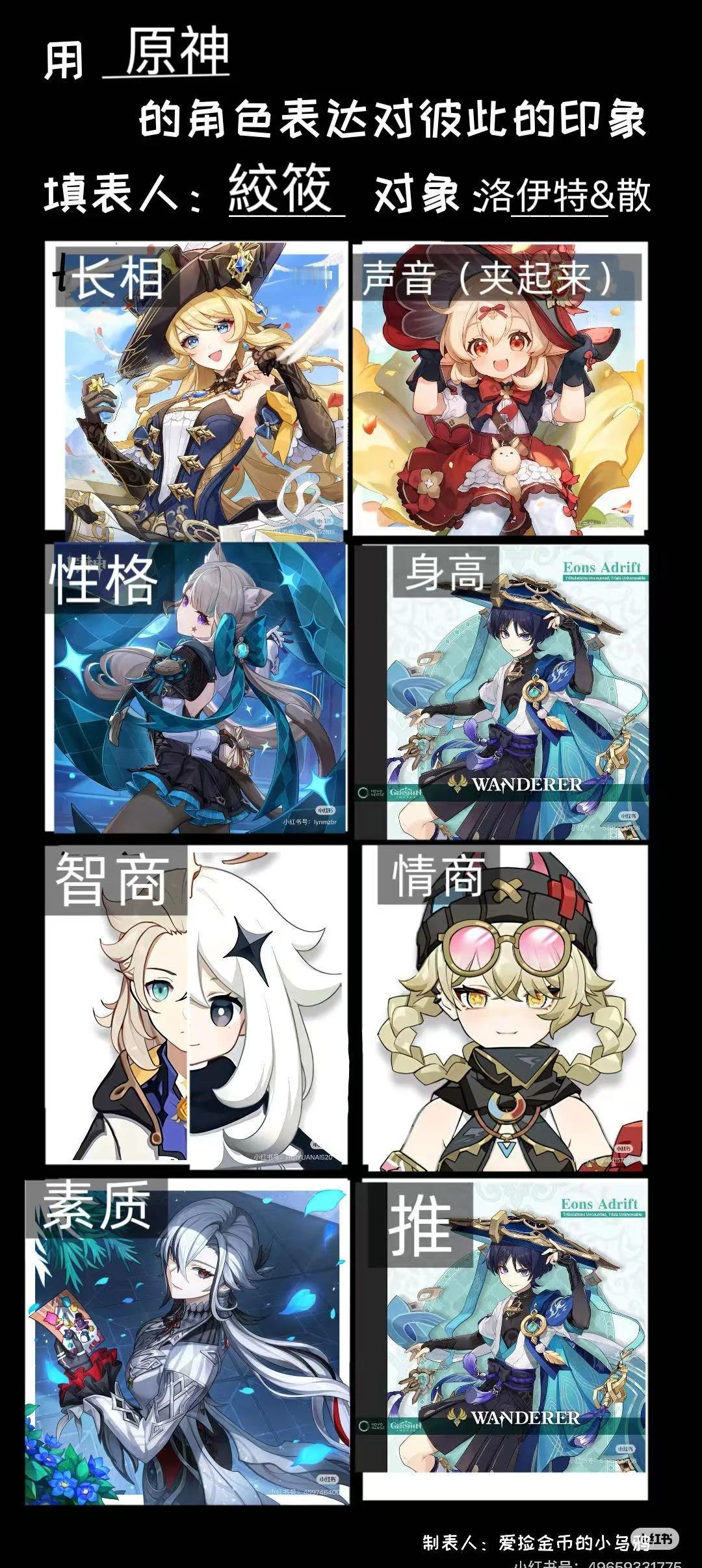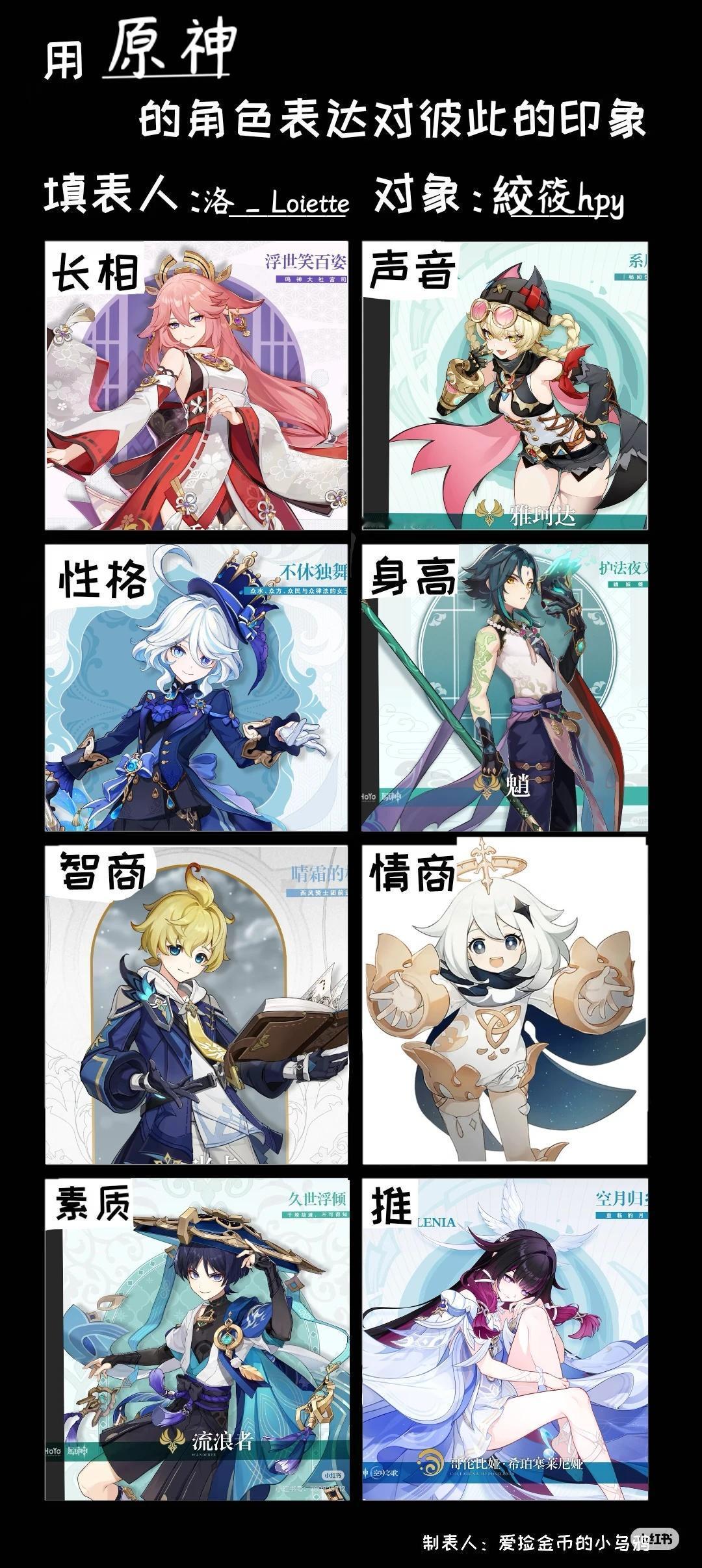好好笑 用原神的角色表达对彼此的印象(嗯对) @唇边雪. 原图在p3 原神 印象互填表格