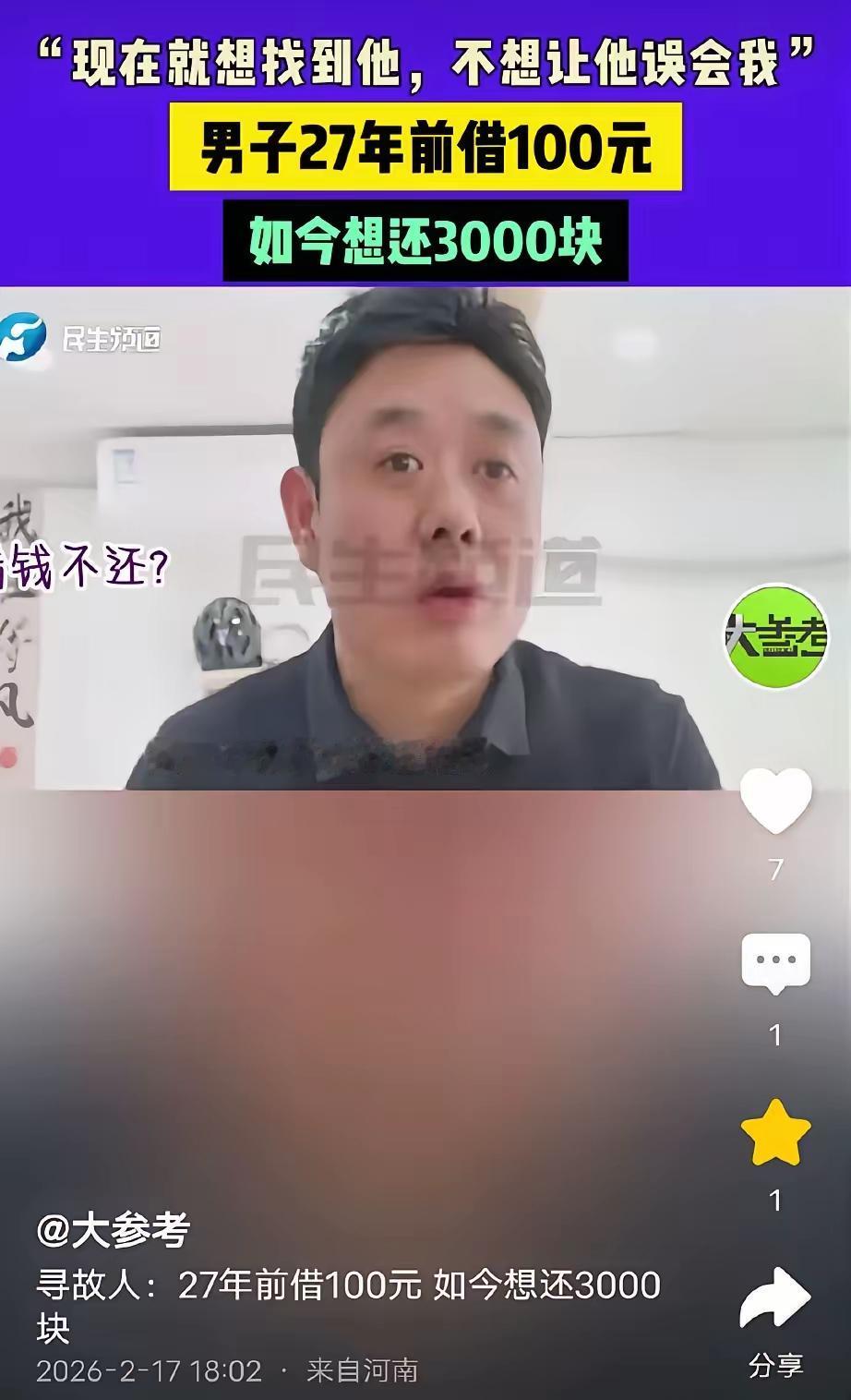 27年,他只为还100块钱!全网泪目:这才是中国人的骨气与良心! 在快节奏、高压力的现代社会,人与人之间的信任似乎越来越脆弱。可就在河南周口,一位普通男子用整整27年的坚持,诠释了什么叫“一诺千金”、什么叫“滴水之恩,涌泉相报”。他的故事没有惊天动地的情节,却让无数网友看完后红了眼眶——只因他执着要还的,是一笔27年前借来的100元。 时间回到2000年,19岁的闫先生孤身一人来到深圳,在围南村西一家名叫“红太阳”的小饭店打工。那时的他,怀揣着对未来的憧憬,却也饱尝异乡漂泊的辛酸。幸运的是,他在店里结识了同龄的何保金——一个来自山东梁山、头发微卷、性格爽朗的男孩。两人年纪相仿,又都是背井离乡谋生的年轻人,很快成了无话不谈的好友。 休息日,他们常一起散步、逛公园,聊聊家乡、谈谈理想。那段日子虽然清贫,却充满温暖。闫先生至今回忆起来,仍觉得那是他青春里最纯粹、最珍贵的时光。 然而好景不长。干了一段时间后,闫先生觉得这份工作没有前途,便毅然辞职,想另寻出路。可现实远比想象残酷。他四处投简历、跑工厂,却屡屡碰壁。身上的积蓄一点点耗尽,最后连吃饭都成了问题。走投无路之际,他硬着头皮回到“红太阳”饭店,向唯一能求助的朋友——何保金开口借钱。 让他没想到的是,何保金二话不说,从口袋里掏出100块钱塞到他手里:“拿着,先渡过难关。钱不急还,有困难随时找我。”要知道,当时两人每月工资不过400元左右,100块相当于四分之一的月收入。这份雪中送炭的情谊,深深烙在了闫先生心里。 他暗自发誓:只要领到第一笔工资,一定第一时间还钱! 命运似乎开了个玩笑。一个月后,闫先生终于找到新工作并领到了薪水。他攥着那张皱巴巴的100元纸币,兴冲冲地赶回饭店,却被告知:何保金已经辞职,不知去向。 没有电话,没有地址,甚至连对方的全名都记不太清——那个年代,朋友之间的联系本就脆弱如风。闫先生只知道,何保金是山东梁山人,有个妹妹,头发有点卷。他四处打听,托工友问、找老乡帮,可始终杳无音信。 这一找,就是27年。 27年间,闫先生结婚生子、成家立业,早已离开深圳,回到河南老家安稳生活。可那100块钱,却像一根刺,扎在他心里从未拔出。他常说:“我不是还不起,我是怕他以为我是个言而无信的人。” 如今,年近五十的他再次站出来,通过媒体公开寻找何保金。他说:“如果能找到他,我想还他2000,甚至3000块。不是因为钱值多少,而是当年那100块,是他在我最绝望时给我的希望。这份情,我欠了半辈子。” 更令人动容的是,闫先生强调:“我还的不是钱,是良心,是承诺,是那段在异乡互相取暖的情谊。” 此事经媒体报道后,迅速登上热搜,引发全网热议。有网友留言:“现在谁还记得27年前借的100块?可他记得,而且记了一辈子!”还有人感慨:“在这个连‘谢谢’都变得敷衍的时代,这样的诚信太稀缺了。” 事实上,从法律角度看,这笔债务早已超过诉讼时效。根据《民法典》规定,普通债权的诉讼时效为三年。但闫先生的行为,恰恰超越了法律条文,回归到人性最本真的层面——诚信,不是因为怕被起诉,而是因为心中有光。 《民法典》第七条明确指出:“民事主体从事民事活动,应当遵循诚信原则,秉持诚实,恪守承诺。”闫先生虽无法律义务必须还款,却用27年的坚守,生动诠释了这一原则的精神内核。他的行为,不是被动履约,而是主动担当;不是偿还债务,而是守护人格。 在这个充斥着“老赖”新闻、信用危机频发的时代,闫先生的故事如同一股清流。它提醒我们:诚信不分金额大小,承诺不论时间长短。真正的体面,不是穿得多光鲜,而是心里装着别人,肩上扛着责任。 目前,记者已根据闫先生提供的线索——山东梁山、卷发、有妹妹等信息,联系当地公安、民政及社区工作人员协助寻人。虽然尚未有确切消息,但无数网友自发转发扩散,希望能帮这位重情重义的河南汉子完成心愿。 我们相信,善意终会回响。也许某一天,何保金看到新闻,会惊讶于当年随手帮过的那个少年,竟把这份恩情铭记了整整27年。而当两位白发渐生的老友重逢,那100块钱早已化作千金难买的信任与情义。 愿这份跨越世纪的牵挂早日落地,愿所有坚守良知的人,都被世界温柔以待。 因为,这不仅是还钱的故事,更是中国人骨子里“言必信,行必果”的精神传承。对诚信的认知 对诚信的感悟