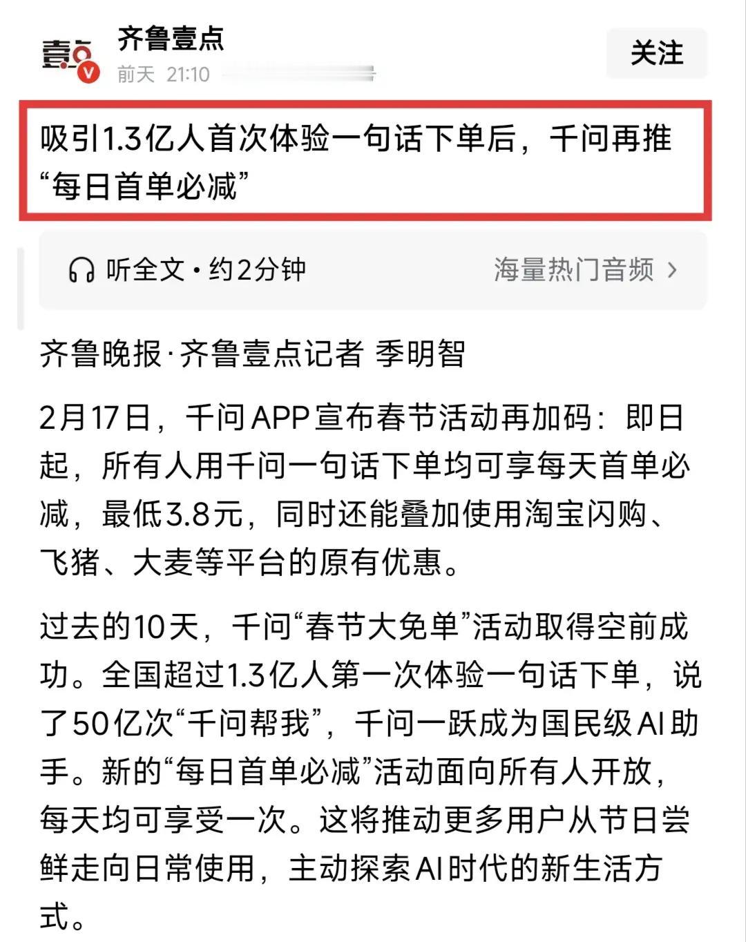 在这个春意盎然、万象更新的季节里,春节的喜庆氛围如火如荼,千问AI成为了全民热议的焦点。它犹如一位智慧的老友,陪伴我们穿越繁琐的年节事务,用一句“吃喝玩乐,一站搞定”点燃了亿万家庭的幸福火花。有人说:“凭啥春节能刷屏?底层逻辑其实很简单——科技赋能生活,幸福就在指尖。” 故事得从李大叔说起。李大叔年过六旬,平日里对手机那是爱恨交织。春节前夕,他的孙子调侃:“爷爷,别再跑到菜市场了,试试千问AI帮你买年货吧!”李大叔半信半疑,但在孙子的鼓励下,试了一次。只见他轻点手机屏幕,千问AI便如一位老朋友般,帮他挑选新鲜食材、推荐健康食谱,还提醒他多喝水、多运动。李大叔笑着说:“这AI不但帮我省时省力,还让我知道了健康的真谛——内外兼修,双管齐下。” 正所谓“身体是革命的本钱”,真正的健康,既要外调调养,又要内修修心。春节期间,千问AI不仅帮人们轻松搞定购物、订票,更引导大家关注“身心双调”。有人在朋友圈感慨:“有了AI的陪伴,春节变得更加丰富多彩,不仅吃得开心,更懂得了健康的重要。” 这背后其实隐藏着一个深层次的底层逻辑:科技赋能生活,正能量传递到每一个角落。千问AI的火爆,正是因为它用幽默诙谐的方式,将“健康”这一大话题融入到日常点滴中,让人们在欢笑中学会感恩、懂得珍惜。 所以,朋友们,春节刷屏的秘密其实很简单:用科技连接情感,用智慧点亮生活。让我们在欢聚一堂的同时,记得“身心双调”,感恩生活的每一份馈赠。只要心怀感恩,健康就在我们身边绽放出最灿烂的光芒! 一句话总结:吃喝玩乐,千问凭啥在春节刷屏?底层逻辑是科技赋能生活,健康由内而外,幸福由心而生。让我们携手共进,迎接更加美好的明天!