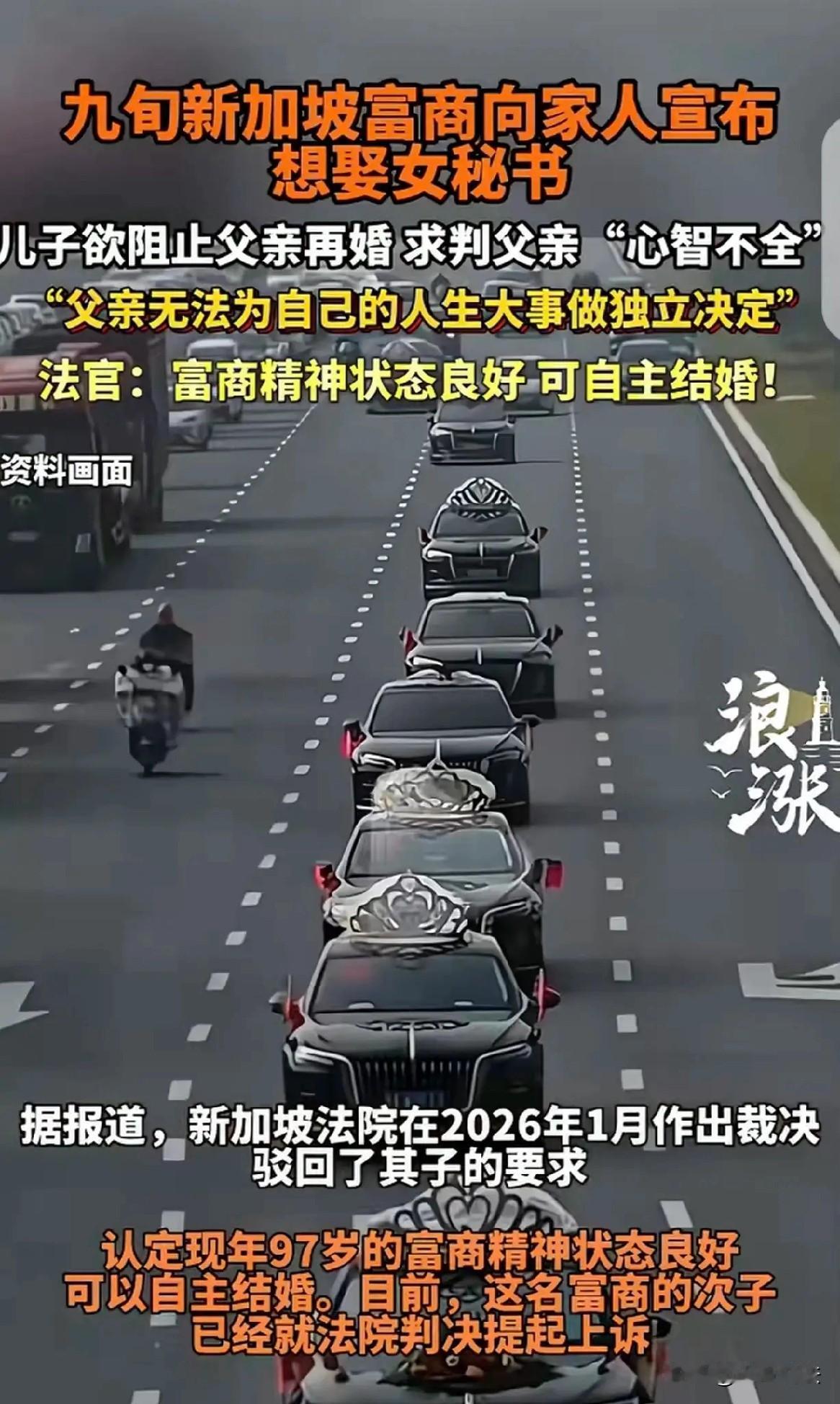 “陪伴50年,假的也是真的!”一97岁大爷突然宣布,他要和女秘书结婚,女秘书陪伴他50年之久,他临死之前,必须给她个名分,儿子跳出来反对,说大爷老糊涂了,女秘书想分家产,老爷子都看不出来,可大爷坚持,这婚非结不可,我们是真感情,儿子告到法院,想要法院阻止父亲结婚,法院到大爷家一查,发现大爷思维清晰,有条有理,结果令人大跌眼镜! 一大爷是个富商,他一辈子打拼了无数的家业,可是他结婚的早,到了四五十岁,他又和一个女子相恋。 女子那时还很年轻,她找工作,找到了大爷当年的公司,从此一后,俩人相识,他们相见恨晚,只恨没有早些认识。 可是,如果离婚,就对不住原配的妻子,大爷犹豫再三,还是维持了原有的婚姻。 女子做他的秘书,对他无限崇拜,从此后眼里容不下别的男子,就这样守着他过了50年之久。 这时的大爷,已经是97岁,他看着昔日的秘书,如今和他一样,也成了满头白发,颤颤巍巍的老太太了。 他们保持了50年的地下关系,秘书始终活在他耀眼的背后,事到如今,他们都是走在了人生的最后,大爷一想,他必须在活着时给女子一个名分。 对于他和女秘书的情况,家里人心知肚明,可是大爷是一家之长,谁也不敢对他说三道四。 可突然一天,大爷郑重其事,把家里所有人都叫到了跟前,他郑重宣布,他要和女秘书举办婚礼。 女秘书花了50年的时光,陪伴在他左右,她不要名分,心甘情愿,大爷越想越对不住她。 如今老伴没了,再也没有拖下去的理由,大爷急切,总怕自己一觉睡得醒不来了。 在大爷心里,他只是给儿孙们做个通知,并不是和他们商量,因此谁也别想在他面前叽叽歪歪。 可没想到,大爷话音刚落,大爷次子跳了出来,他面红耳赤,说父亲这是老糊涂了。 这么大的岁数,还要结婚,不怕被人笑话,让他们的颜面又搁在哪里? 其他人一看次子挑头,他们立刻表示附和,这事荒唐,一定会让人笑掉大牙。 可大爷表示,我有今没明,女秘书跟我多年,我们早就情比金坚。 她一辈子无名无分,在我背后,受尽了人们的闲言碎语。 我活着时,她都不被善待,如果我要死了,你们又不知道会咋样对她! 可儿子认为,父亲害怕是老糊涂了,他97岁,心智不全,说话有一出没一出的,这可能是又犯了迷糊。 儿子还认为,女秘书非要嫁给父亲,肯定是意有所图,谁会去爱一个97岁的老头子,说她没有目的,根本没人会相信的。 即便是真有感情,他们也相处了50年的光景,既然50年都没结婚,这就代表这是最好的相处方式,你们继续保持,依旧没有人会阻止。 如今父亲一天天的老去,女秘书肯定等不及了,硕大的家产,她早就虎视眈眈50年了。 如今她再不努力,这一辈子就算白费,父亲和她结婚,岂不是老了老了又被对方给算计了? 如果不婚,等到父亲去世,她就没有理由再留下去,到那个时候,自己绝对会轰她走人,休想在我们家里,多待一分钟都不行! 如果让他们顺利结婚,那父亲的财产,就会有她一份,她打的如意算盘,隔着大门都传到了耳里。 可大爷坚持,非和女秘书结婚不可,女秘书的真假,只有他看的最清。 她是不是图我的财产,要图年轻时就图了,没人会拿一辈子去骗取那些身外之物。 如今我们都老了,吃吃不动了,钱也花不了几个,她要钱干嘛?她可没你们想的那样唯利是图! 次子一看,劝不动老爷子,他一急之下,告到了法院,要求法院阻止父亲和女秘书的婚事。 他告诉法院,父亲已经老糊涂了,思维不清,不能做出正确的决定。 法院接到申请,很快受理了这件案子,因为情况特殊,工作人员到老人家里,亲自和老人谈话,观察他的一举一动。 法院还请来了专业医生,给老人做了状态评估,经过一系列的措施,法院发现老人的思维没有任何问题。 他思路清晰,语言表达有条有理,精 神良好,根本就不像97岁的老人。 法院认为,老人完全有能力做出决定,他要不要结婚,是他的自由。 老人虽说年纪大了,可他和女秘书都是单身,任何人都不能阻止他们结婚。 法院判决,老人思路清晰,状态良好,完全可以自主结婚。 儿子急了,他不服气,法院怎么能够允许父亲结婚? 他要上诉,这不公平,他继续收集证据,想在二审时再次证明父亲不具备结婚的能力。 《民法典》第1041条规定,实行婚姻自由、一夫一妻、男女平等的婚姻制度。 婚姻自由是公 民的基本权利,只要大爷和女秘书都是单身,哪怕两人加起来快两百岁,也没人能阻止他们结婚。 儿子认为父亲是“老糊涂”,但法院已经通过医生评估,确认大爷思维清晰,能为自己的决定负责,所以他的结婚意愿完全合法有效。 儿子觉得女秘书是图钱,但法律只看婚姻双方的真实意愿,不关心动机。 就算女秘书真的看中家产,只要大爷是自愿结婚,法律也不会干涉,毕竟财产分配是大爷自己的事,他完全可以通过遗嘱提前做好安排,和结婚自由是两码事。 对此,你怎么看?