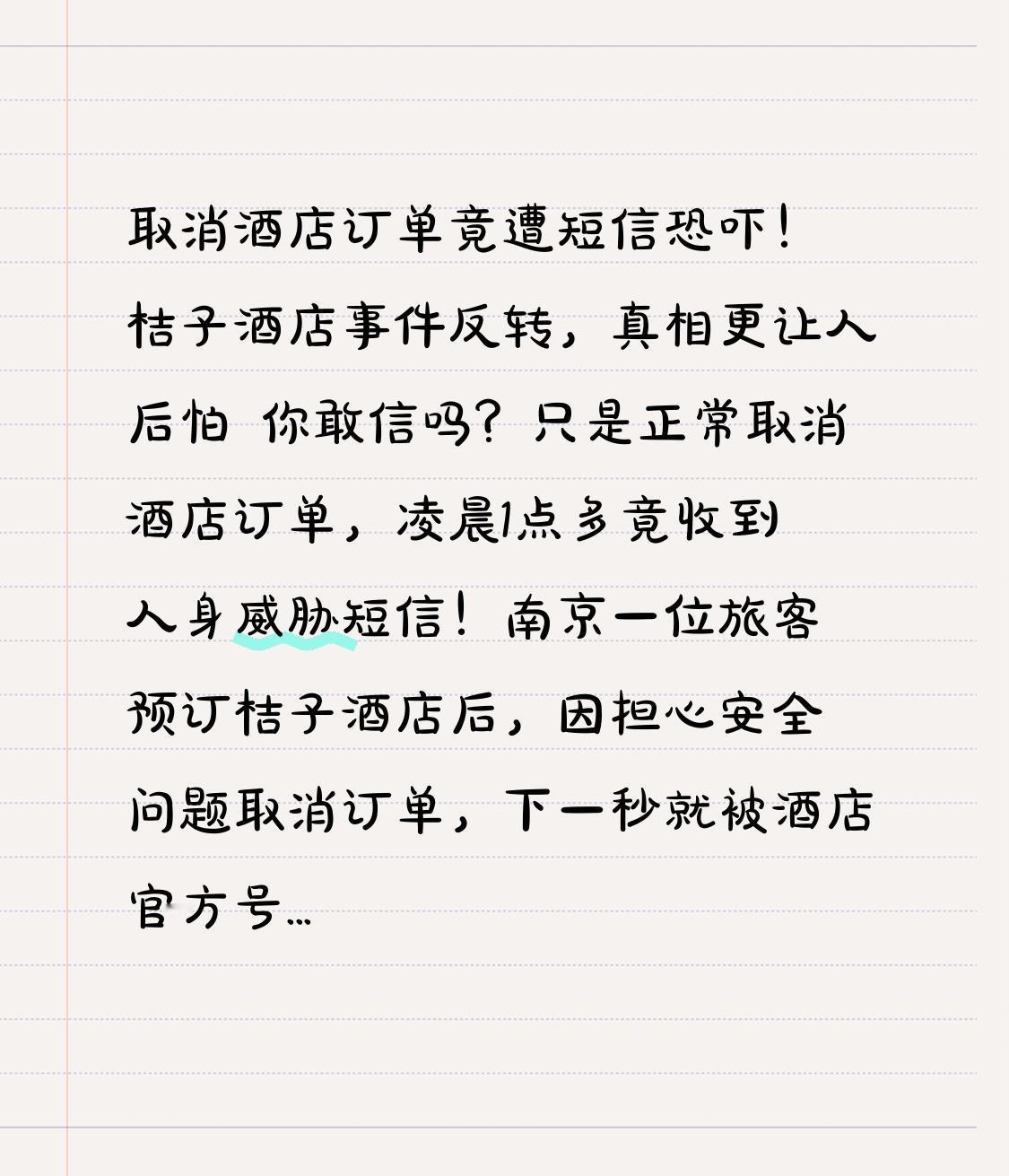 取消酒店订单竟遭短信恐吓!桔子酒店事件反转,真相更让人后怕 你敢信吗?只是正常取消酒店订单,凌晨1点多竟收到人身威胁短信!南京一位旅客预订桔子酒店后,因担心安全问题取消订单,下一秒就被酒店官方号码发来恐吓信息,内容不堪入目,当事人吓得连夜报警! 一开始全网愤怒:消费者合法取消订单,凭什么被威胁?连锁酒店竟敢如此嚣张?大家一边倒指责酒店服务恶劣、管理失控,要求严惩责任人、公开道歉赔偿。谁也没想到,事件很快迎来大反转。 酒店紧急回应并报警:经查,当晚值班员工无操作记录、IP不对,监控也证实无人发送信息,初步判定是系统被黑客入侵,并非员工所为。酒店直呼委屈,称刚试营业,绝无动机得罪客人。一边是消费者惊魂未定,一边是酒店喊冤,事情一下子陷入罗生门。 不管是人为还是黑客,这件事都戳中了所有人的安全感痛点:我们住酒店、订民宿,信息全在平台,手机号、订单状态一目了然,一旦系统失守,恶意信息、隐私泄露、人身威胁随时可能找上门。官方通道发恐吓消息,比陌生骚扰更可怕! 这不是某一家店的问题,而是整个行业的安全漏洞警钟:平台权限管理严不严?消息系统有没有防护?用户数据谁来保护?出了事,一句“黑客入侵”就能免责吗?消费者的安全谁来兜底? 出门在外,平安最贵。我们要的不是反转剧情,而是真相、追责与整改。希望警方尽快查清源头,给当事人一个交代,也给所有消费者一个安心。也提醒大家:订房留好证据,遇到威胁立刻报警,保护好自己比什么都重要。 这件事你站哪一边?你遇到过酒店恶意骚扰吗?评论区说说你的经历,提醒更多人出门留心!