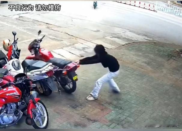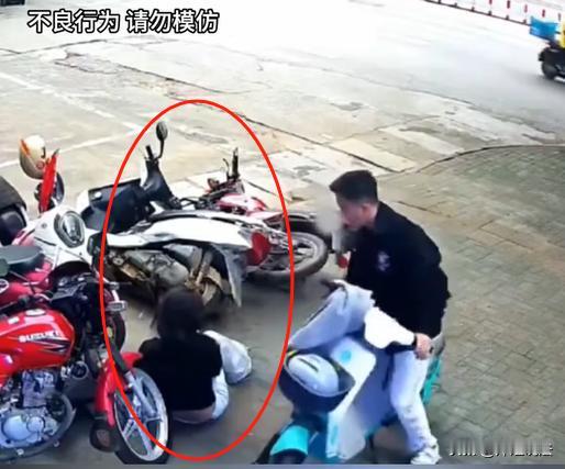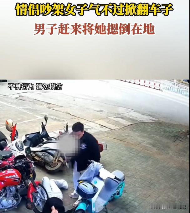 一对情侣吵架,女子发脾气直接把路边的摩托车全都推倒在地,男友看到了,立刻追过来将