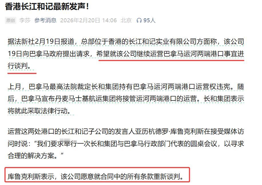请求谈判!李嘉诚长江和记最新发声! 李嘉诚旗下的长江和记实业有限公司发表最新声明,希望就继续运营巴拿马运河两端港口事宜进行谈判,该公司愿意就合同中的所有条款重新谈判。 记得前几天,李嘉诚公司的态度还挺强硬,说要采取法律行动,没想到这么快就妥协让步了。根据2021年签订的协议,经营权延续25年,到2046年,也就是说还剩下大概20年的经营权。 重新谈判,无疑是利益的重新分配,让巴拿马政府获得更多收益。一种方式就是提高巴拿马政府的收益分成,多分点钱,多收点税。另一种方式就是分割经营权,让其它企业一起来经营,比如让马士基集团共同经营。 估计第二种方式比较符合巴拿马及其背后的美国的利益,但谈判难度依旧会很大,人家就是想把运营权收回去,而且还不想付违约金,反正你也不能奈何。 看得出来,李嘉诚也是没办法了,如果选择硬刚到底,很可能彻底失去巴拿马两个港口的运营权,那损失就大了。现在自己主动让步,寻求谈判,还有一丝希望能保留一部分利益,至少损失没那么大。 接下来就看谈判的结果了,个人对结果不抱太高的期望。