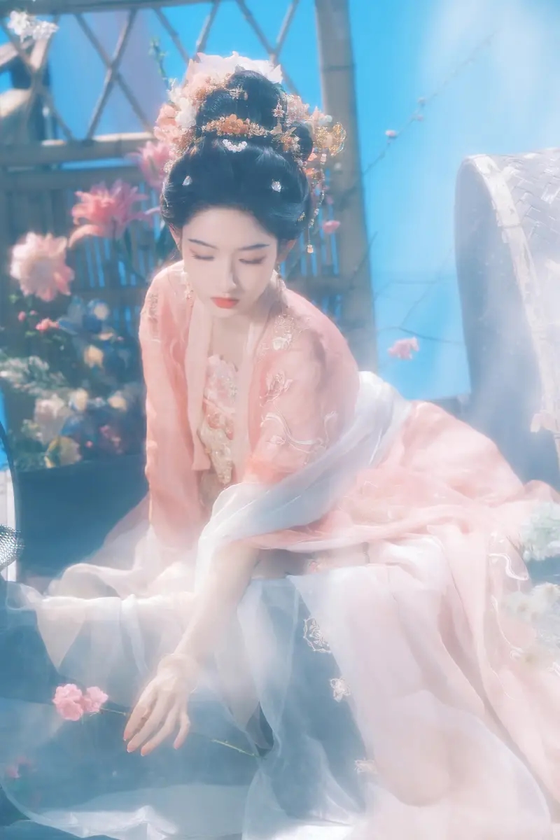 王玉雯身着刺绣汉服古典灵动 轻触花枝眼神澄澈又妩媚