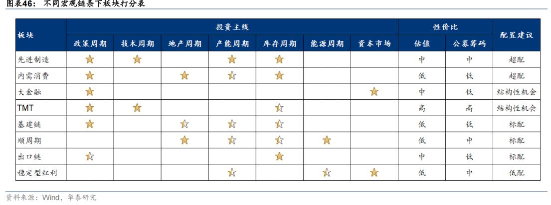 过年除了完成应尽的礼节和陪伴义务,还要同步调整的自己的身体和精神状态。看一些值得学习的材料和报告也是精神放松的一种方式,值得分享的依旧会在头条分享给大家。 华泰证券在年度策略报告中,根据七大投资主线的逻辑,以及当前估值性价比,对几大主要风格板块进行了宏观打分。超配和标配的含义我就不多做解释了,结构性机会指的就是这个板块可能难以有全面普涨的机会,其中部分细分行业和公司会有机会。 先进制造和内需消费是华泰建议超配的两大板块,大金融和TMT是其认为存在结构性机会的。