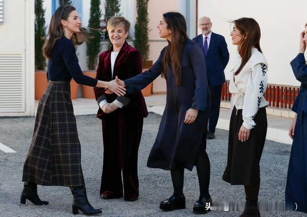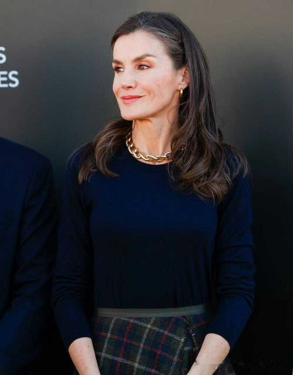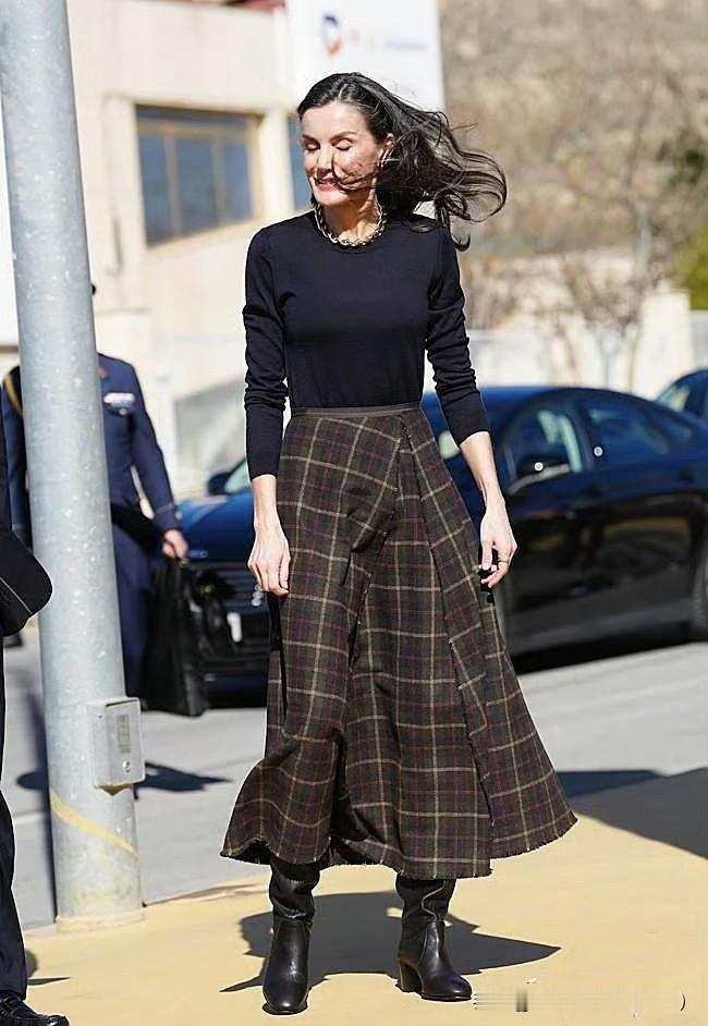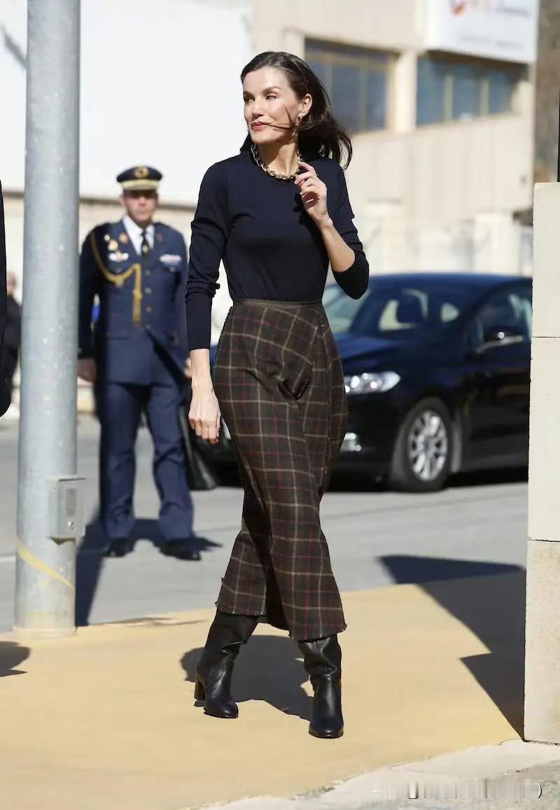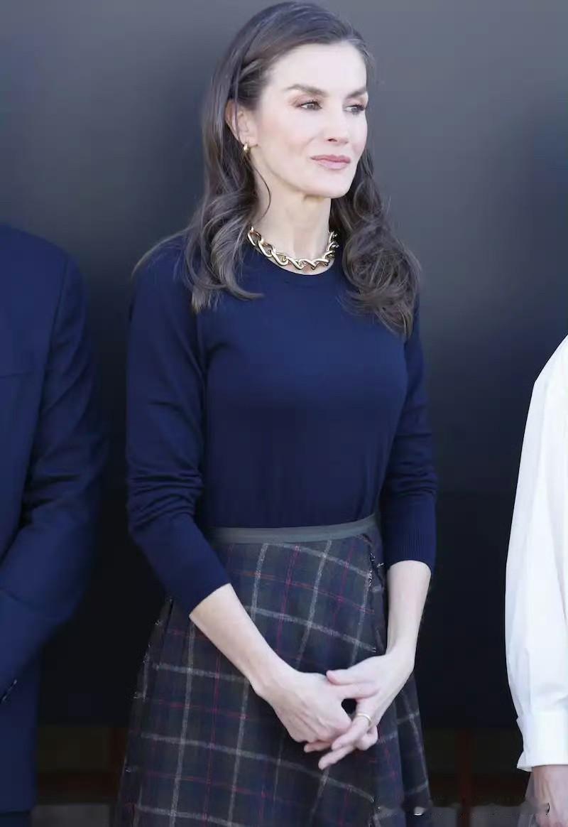 莱蒂齐亚王后出席Pedro García鞋业公司成立百年纪念活动,搭配了该品牌的靴子,藏蓝色针织衫搭配格纹半裙,珠宝选择金色系,也非常出彩!王后的整体造型优雅利落!