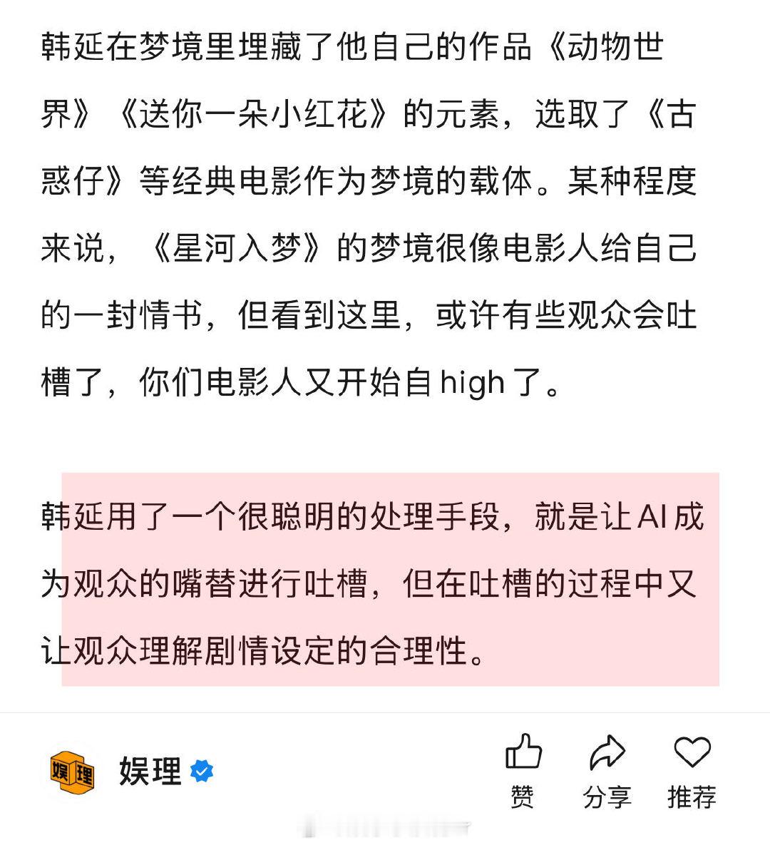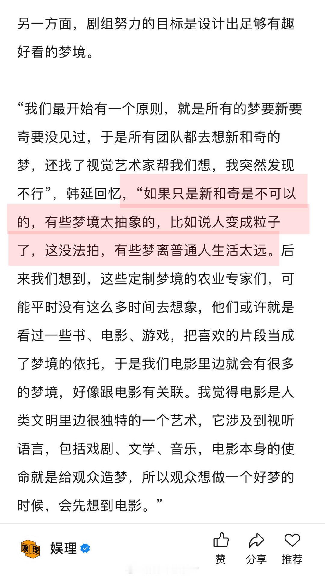 导演说王鹤棣宋茜是战友情 星河入梦导演说王鹤棣有使不完的劲 据导演韩延透露,《星河入梦》还拍了古装梦境,但剪辑阶段都删掉了,“要么是视觉有重复感,要么是色彩不够斑斓,要么就是让风格有点往下掉,我就把那些都忍痛割爱给删掉了,其实那些梦境我们都做完了,最后至少得删掉了一半的梦。”娱理独家↓