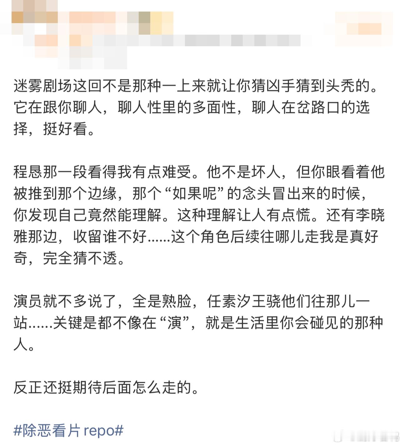 除恶业内评价 业内一致看好不是没有道理!故事紧贴现实,深挖人性暗处,既有紧张的案件张力,又有动人的情感刻画,质感拉满✨