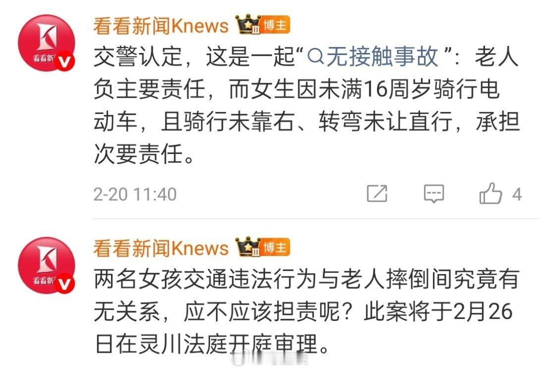 交警都认定,这是一起“无接触事故”:老人负主要责任,而女生因未满16周岁骑行电动车,且骑行未靠右、转弯未让直行,承担次要责任。