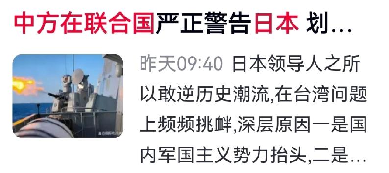 怎么看中方在联合国严正警告日本,说四点认知看法: 其一,中方在联合国严正警告日本:介入台海即侵略,红线绝不容逾越! 其二,中方在联合国明确表态:台湾问题是中国核心利益中的核心,日本若以任何借口派遣自卫队进入台湾海峡、武力干预中国统一进程,将被直接定性为侵略行为,中国必将采取一切必要措施坚决反制。 其三,作为二战战败国,日本违背国际公约、企图挣脱战败枷锁、纵容“台独”分裂势力,是对二战胜利成果的公然践踏。中国军队全时备战,14亿人民意志如钢,有坚定决心和强大能力捍卫国家主权。 其四,任何外部势力胆敢插手台海、破坏统一,必将遭到迎头痛击。历史不容篡改,主权不容侵犯,胆敢越界者,必将承担一切严重后果! 对此你怎么看?欢迎各位读者来评论区讨论,留下你的认知度!