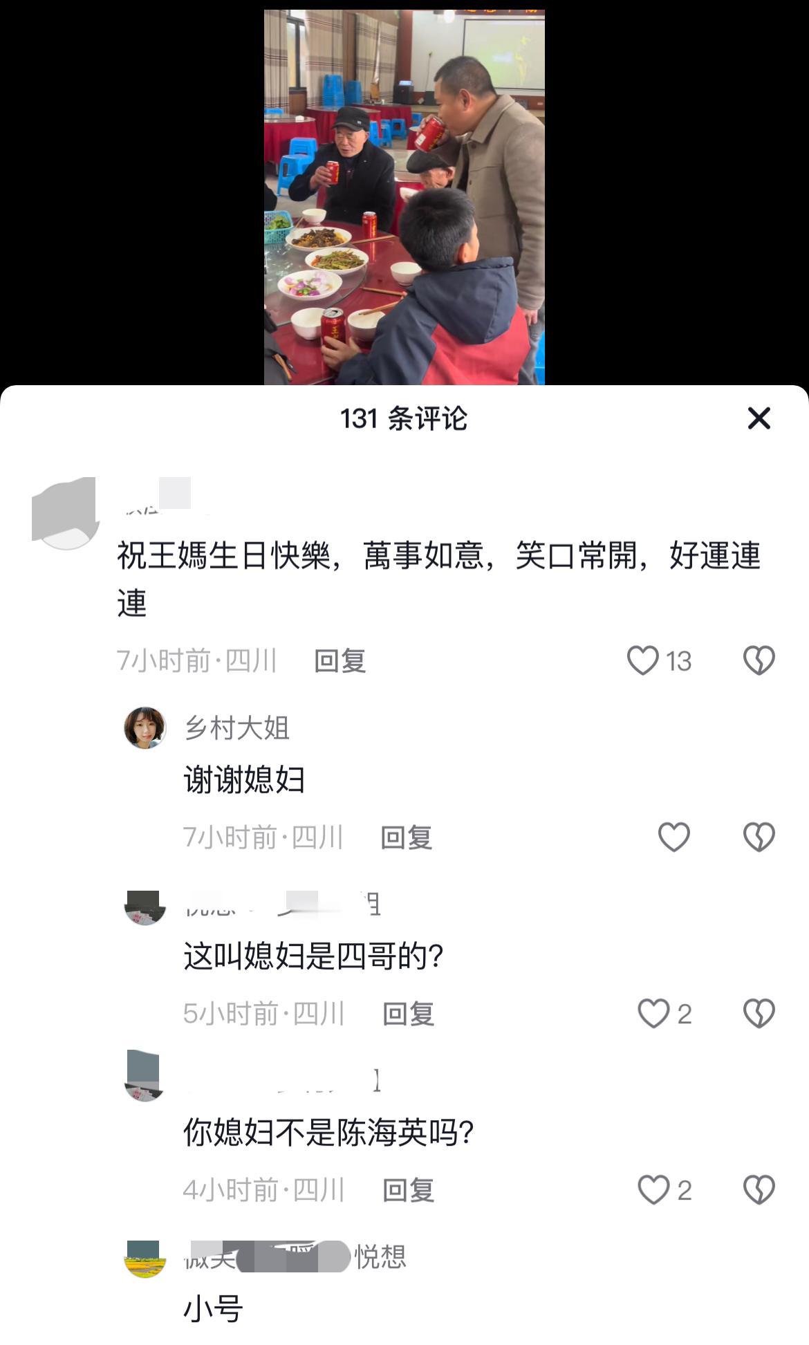 农村四哥的妈妈过生日,一大家人团聚吃饭,小英子小号现身评论区祝王妈生日快乐! 小英子带着三个孩子到广西过年还没有回四川,王妈生日,大姐一家,三姐一家,幺舅及王四等都出现在宴席上。 乡村大姐发视频,评论区有个ID祝王妈生日快乐,大姐回复:谢谢媳妇,众人很诧异,这不是大姐喊小英子的称呼吗?又有人回复这是小号。 农村四哥自从房屋封顶后,就没有再发视频。王平结婚去迎亲,六妈发视频。过年在幺舅家吃饭,幺舅发的视频,王四妈妈生日吃饭庆祝,大姐发的视频。 也不知咋回事!