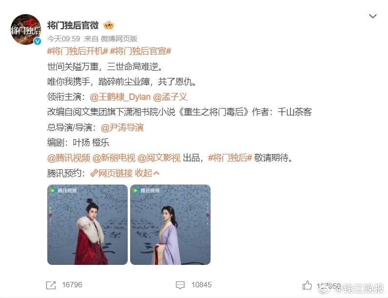 【#将门独后官宣王鹤棣孟子义#】2月20日,官宣开机,领衔主演,并发布角色定妆照、双人海报等,谢景行、沈妙终于来了!你期待吗?#将门独后开机##容止 谢景行#(新浪娱乐)