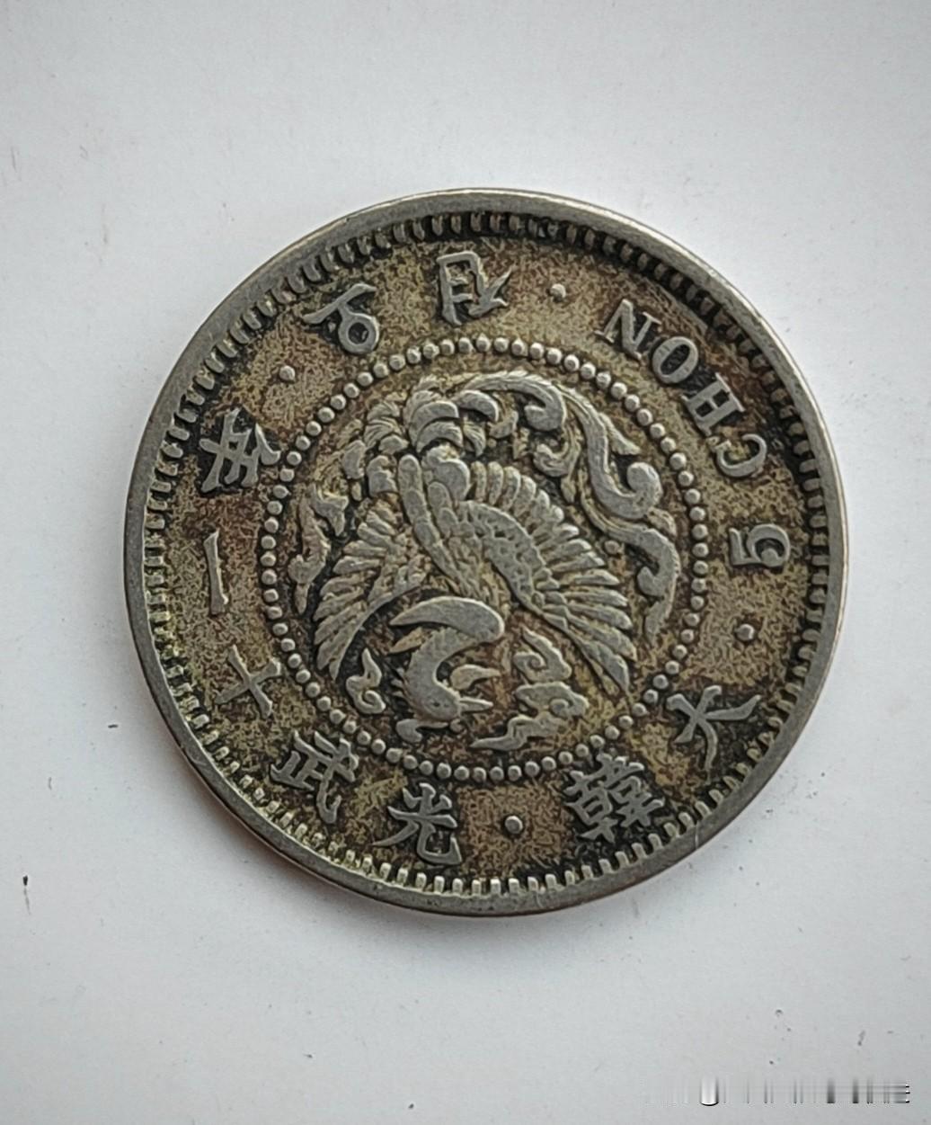 偶然所得的一枚大韩光武十一年;五钱古钱币,直径:11毫米、重量4.6克;据查是朝鲜王朝光武年间(1897-1907年)的流通货币,属于朝鲜近代货币体系的代表性品种。 根据本人所提供图片等信息,请网上高手针对此币真伪及价值,给出大概评估。