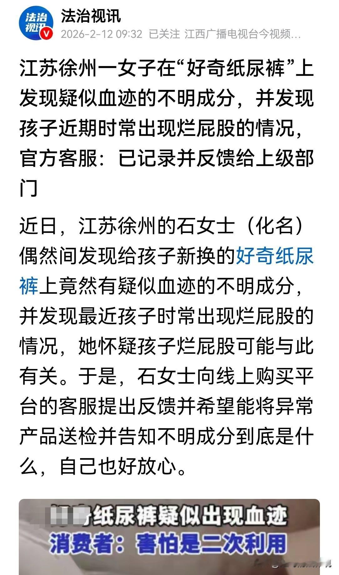 太离谱了!江苏徐州,女子给孩子换纸尿裤时,突然被出现在眼前的一幕惊呆了,纸尿裤上竟然有血红色不明成分,她怀疑是“姨妈”血迹。而近期,孩子已出现烂屁股的状况,女子向购买平台提出,将收到的异常产品送检,并讲明不明成分到底是什么,毕竟孩子这么小。而平台给出的解决方案,令女子无法接受! 石女士最近遇到了一件让她既揪心又气愤的事。 作为一位年轻妈妈,她对孩子的用品,向来格外谨慎,用的都是知名品牌的产品。 可没想到,她给孩子用的某知名品牌纸尿裤,却让她栽了跟头。 事情要从一周前说起。 那天,石女士像往常一样,给5个月大的女儿换纸尿裤。 刚拆开新包装的产品,她突然发现内层有一块暗红色的痕迹,像是干涸的血迹。 她凑近闻了闻,没有明显异味,但用手触摸时,能感觉到微微的颗粒感。 “这到底是什么?”石女士的心猛地揪紧了。 她立刻检查孩子的皮肤,发现小屁 股上布满了红疹,有些地方甚至破皮结痂。 这和之前偶尔出现的尿布疹完全不同,更像是长期刺激导致的烂屁屁。 莫非真和纸尿裤有关?石女士的脑海中闪过这个念头。 她不敢怠慢,毕竟孩子这么小,她翻出家里剩余的同批次纸尿裤。 逐一检查后,又在两片内层发现了类似的暗红色痕迹。 更让她不安的是,女儿最近一周频繁哭闹,每次换尿布时都哭得撕心裂肺,原本白嫩的小屁屁变得又红又肿。 石女士赶紧翻出手机,在宝妈群里搜索相关信息。 这一搜,她后背直冒冷汗。 原来早在半年前,就有网友曝光过,不良商家将废弃卫生巾材料与纸尿裤原料混合二次加工的乱象。 她想起自己确实曾在某电商平台买过“临期特价”的纸尿裤,当时客服信誓旦旦保证“绝对正品”,现在想来,难道…… “必须查个清楚!”石女士强压着怒火,先带孩子去了妇幼保健院。 检查后确认是接触性皮炎,建议立即停用当前纸尿裤,并开具了抗过敏药膏。 石女士拍下纸尿裤上的可疑痕迹,连同孩子的病历一起,联系了线上购买平台的客服。 我们理解您的担忧,可以为您办理这包产品的退款。 客服的回复让石女士火冒三丈。 退款?我孩子的小屁屁烂了半个月了,你们就一句退款? 她要求将异常产品送第三方机构检测,还要明确告知,不明成分究竟是什么。 至少得知道,是不是病 菌或者化学物质吧? 客服的回应却让她更加心寒:我们只能按照流程处理,检测需要总部审批…… 石女士试图讲道理,如果是生产环节出问题,难道不该主动召回? 如果是恶意造假,其他宝宝也有风险啊! 可无论她怎么沟通,对方始终重复着已记录,会反馈的套话。 更让石女士崩溃的是,当她提出要退掉家中剩余的20多包同批次纸尿裤时。 客服竟然要求她提供,孩子生病与产品直接关联的医学证明。 这不是刁难人吗?石女士气炸了。 她抱着哭闹的女儿,眼泪直往下掉,哪个妈妈会拿孩子健康开玩笑? 无奈之下,石女士联系了当地媒体。 面对镜头,她哽咽着表示,自己不是要讹钱,就是想要个真相。 如果真是质量问题,得让更多家长知道;如果是有人造假,也得揪出来严惩啊! 记者随即拨通了纸尿裤官方客服热线。 接线员语气谨慎,我们已将情况记录并反馈给上级部门,后续会有专员联系消费者。 当被追问为何拒绝送检时,对方沉默片刻后表示,具体处理流程不便透露。 截至发稿前,石女士仍未收到,任何来自品牌方的正式回应。 她翻出家中剩余的纸尿裤,看着包装上“医护级认证”、“柔软亲肤”的宣传语,只觉得无比讽刺。 现在只能先用传统尿布,虽然麻烦点,但至少安心。 她叹了口气,把最后半包纸尿裤扔进了垃圾桶。 这件事,在宝妈圈引发了强烈反响。 不少家长表示,将联合向市监部门投诉,要求彻查涉事批次产品流向。 而石女士的诉求很简单:我不要赔偿,只要一个公开的检测报告,和一句真诚的道歉。 她摸着女儿还在脱皮的小屁屁,觉得应该给孩子讨个公道。 不然,还会有更多家长和她一样,在不知情中给孩子用着问题产品; 而且,她更担心,如果真是质量问题,受害者还会源源不断。 《消费者权益保护法》第19条:经营者发现其提供的商品或者服务存在缺陷,有危及人身、财产安全危险的,应当立即向有关部门报告和告知消费者。 并采取停止销售、警示、召回、无害化处理、销毁、停止生产或者服务等措施。 采取召回措施的,经营者应当承担消费者因商品被召回支出的必要费用。 石女士发现纸尿裤上有不明成分,孩子使用后出现皮肤问题。 很可能说明产品存在危及孩子皮肤健康等安全的缺陷。 销售平台、和品牌方应及时向相关部门报告,并告知其他消费者,同时停止销售涉事批次产品。 石女士反馈后,平台和品牌方未积极采取措施,只是给出退款等不合理方案, 明显没有履行保护消费者权益的义务。 对此你怎么看? 天南地北大拜年 关注@赵哥的法律观,欢迎评论区发表您的看法。