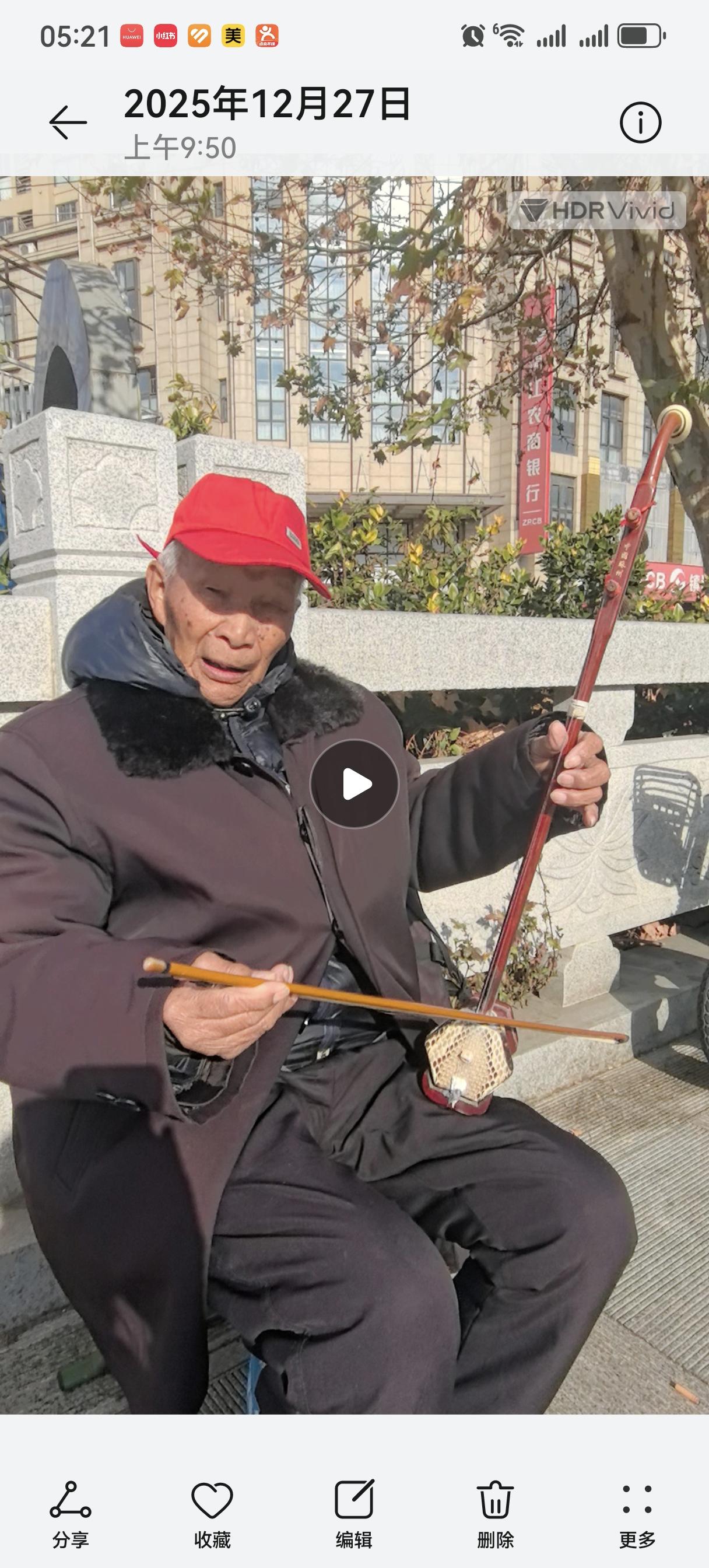 这是一位93岁的老人,原来是一所公共厕所的管理员,和老伴两人,管理一座公共厕所。 十多年前,老人突然爱上了拉二胡,每天下午三、四点钟,就用一张小凳子,坐在马路旁很认真地拉一把半新的二胡,老伴坐在旁边陪着他。 每次看到拉二胡的老人,我都会停下脚步看一会,并认真地听他拉二胡。只是,听了无数遍,都没听清楚他到底在拉什么,拉的是什么曲子。更直接地说,没有拉全一支曲子。但是,仍然在非常认真地拉着,只要不是恶劣天气,每天都会出现在马路边。 四年前,他的老伴去世了,他告诉我,老伴与他同年同月同日生,去世时89岁。他们曾在苏州一起学过快板,他还给我讲了一小段快板,只是淮安口音比较重,听得不太清楚。看得出来,他确实学过快板。 春节前,他回淮安老家去了,节后回来,回到他现在生活的城市——镇江,继续在九里街拉他的二胡,我也会每次走过他面前时,停下来听他不完整的曲子。