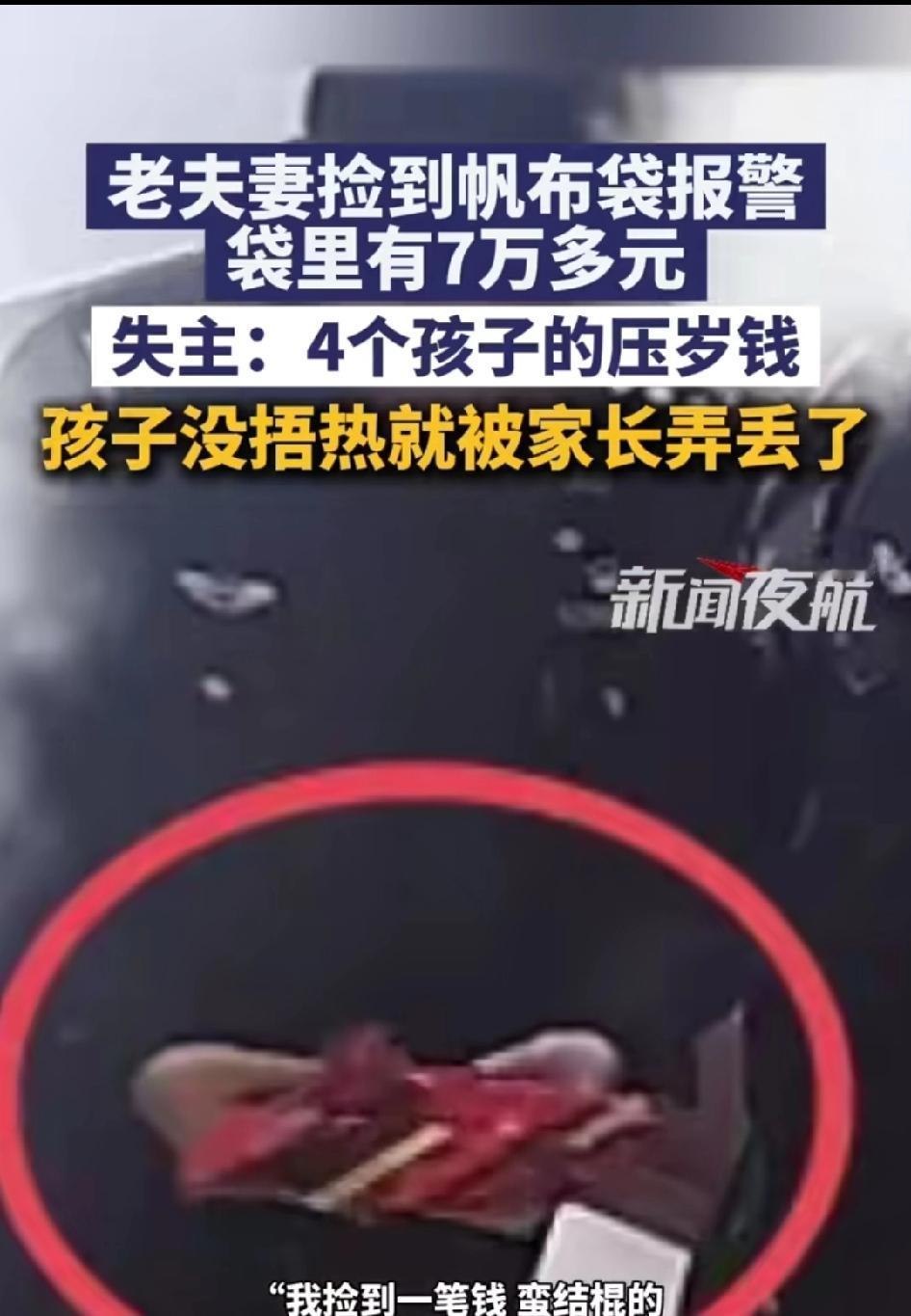 上热搜了!上海普陀,田老伯和老伴在除夕夜散步,一只帆布袋引起了他们的注意。凑近一看,老两口当场吓了一跳,确认不是旁人落下的东西后,没丝毫犹豫就匆匆赶往长风新村派出所报案。 2026年2月16日,除夕夜,上海普陀区枣阳路师大二村附近,家家户户的窗户都透出暖黄的灯光,远处的烟花在夜空里炸开,把街道映得忽明忽暗。田老伯和老伴裹着厚棉袄,手挽着手慢慢走,脚下踩着零星的鞭炮碎屑,空气里飘着红烧肉和糖炒年糕的香气,是年夜饭刚散的味道。 走到一处路灯下,一只灰扑扑的帆布袋静静躺在路边,拉链没拉严,还露出一角红彤彤的红包。田老伯弯腰轻轻一提,拉链拉开的瞬间,老两口的呼吸都停了——里面整整齐齐码着二十多个红包,一沓沓捆好的百元大钞露在外面,在昏黄的路灯光下晃得人眼晕。老太太的手指抖了一下,赶紧按住袋口:“老头子,这可怎么办啊?” 田老伯蹲在地上,心里像压了块石头:今天是除夕夜,这么多钱还是一包包红包,一看就是谁家孩子的压岁钱,丢的人现在肯定急疯了,这个年都过不安稳。 这一片区虽然有监控,但当时正是年夜饭的热闹时段,路上行人不多,要是换作旁人,或许会有别的念头。可田老伯和老伴攥着沉甸甸的帆布袋,脚步一刻没停,心里只有一个念头:这么多钱,丢的人一定急坏了,必须赶紧送到派出所。 到了长风新村派出所,他们把袋子往民警面前一放,声音都带着几分替人着急的慌张:“警察同志,我们捡到一大袋钱,全是孩子的压岁钱,您快帮忙找找失主!” 民警当场清点后,大家才惊掉下巴——里面整整齐齐码着二十多个红包,一叠叠现金看得人眼花,金额竟然高达七万多块钱。 随后,民警立刻调阅周边公共视频,画面里的时间线一点点往前推:就在十几分钟前,一辆家用轿车因车门故障在路边临时停车,副驾驶车门打开后,一个黑色的帆布袋从车内滑落,落在了路边。顺着车辆信息,民警迅速联系上了失主周先生。 电话那头,周先生的声音带着哭腔:“我……我刚吃完年夜饭,那是四个孩子的压岁钱,是长辈给的祝福,要是找不回,这个年都过不安稳!” 当周先生急匆匆赶到派出所时,整个人都还在慌神,额头上全是急出来的冷汗,羽绒服拉链都没拉好。他一进门就抓住民警的手,嘴唇哆嗦着说不出话。 这袋钱,是他四个孩子的春节压岁钱。孩子们刚开开心心收完,还没捂热乎,他下车时车门故障,一个大意,直接把整袋钱落在了路边。 当那袋熟悉的红包重新递到周先生手里时,他双手颤抖着接过,眼泪瞬间就涌了上来,对着田老伯夫妇连连鞠躬,声音哽咽得不成样子:“真的太感谢你们了!” 田老伯和老伴只是憨厚地笑了笑,脸上布满岁月留下的皱纹,眼神朴实又坦荡:“不是我们的钱,一分都不能要。这都是孩子的压岁钱,是长辈的心意,我们哪能拿。” 没有豪言壮语,没有刻意表演,没有拍视频博流量,只有最朴素的良心,最干净的人品。七万多元,对普通家庭来说绝不是小数目,可能是几个月的生活费,可能是孩子一年的学费。可在两位老人心里,再大的钱,也抵不过一句“不是我的,我不要”,抵不过除夕夜心里坦坦荡荡、睡得安稳。 警民联动,仅用30分钟就将七万余元压岁钱完璧归赵。平凡人最动人的,不是钱多钱少,而是遇事不贪、心正心安。这才是过年最该上热搜的中国人。 上海正能量拾金不昧除夕夜暖心事凡人善举过年最动人的瞬间 来源:新闻夜航及网络公开内容,如有侵权请联系即删 配图说明:本文配图/视频素材来自@新闻夜航 ,仅用于内容分享,侵权联删
