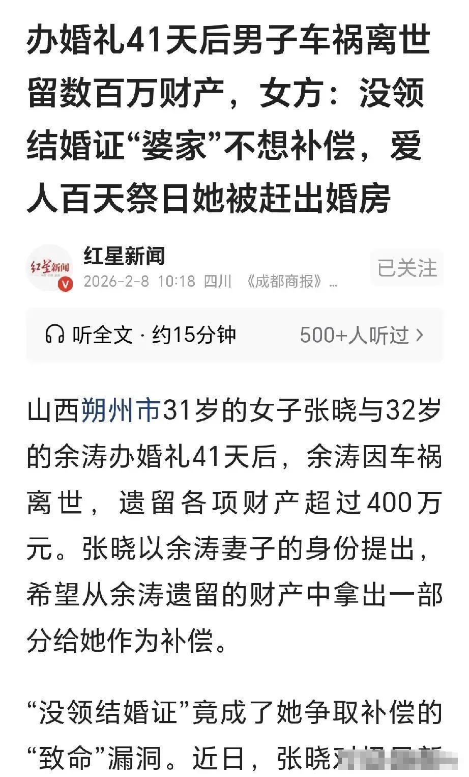 千万别高估人性!山西朔州,一31岁女子和32岁男子举办了婚礼,也发生了夫妻关系,但没领证,41天后,男子车祸死亡,女子以妻子身份为男子端灵,抱骨灰盒,打砂锅,不料,男子400万遗产全被婆婆拿走,男子百天祭日,婆婆派4个男子将她赶出婚房,女子要求补偿,婆婆承诺给她30万,事后又反悔,还把女子告到法院,要她返还彩礼49.7万,女子急了,反诉婆婆,以妻子身份,请求分割200万财产。   31岁的张晓和32岁的余涛,2023年11月经媒人介绍认识,俩人情投意合,很快就确定了恋爱关系,没过多久就同居了。 同居的时候,张晓真心实意过日子,余涛下班晚、周末还加班,家里买菜做饭、日常起居都是张晓打理,就连余涛的网店副业和证券账户,也都是张晓帮忙管着,俩人的钱也混在一起用,互有转账,怎么看都是奔着一辈子去的。   2024年10月俩人订了婚,2025年5月7日在老家风风光光办了婚礼,所有亲友都来道贺,谁都以为这对小夫妻会幸福下去。 本来约定好5月20日去领结婚证,可余涛刚好接到新公司的入职通知,这份工作是他费了好大劲才找到的,特别珍惜,俩人就商量着以后再补领证,万万没想到,这个决定成了后来所有纠纷的导火索。   婚礼刚过41天,6月11日那天,余涛骑摩托车上班途中出了车祸,张晓接到消息当场崩溃,第一时间赶到医院交了急救费,抖着身子签了病危通知书。 余涛的妈妈和弟弟也赶了过来,两家人日夜守在医院祈祷,可奇迹没能发生,7天后余涛还是走了。   接下来办丧事,余家人一口一个“儿媳”叫着,让张晓以妻子的身份发讣告、端灵、抱骨灰盒,还按老家的风俗让她“打砂锅”——这风俗本来是父母离世由儿子来,没子女的就由配偶来,明明白白把她当妻子对待。 张晓也没含糊,全程以妻子的身份送余涛最后一程,那份悲痛和付出,周围人都看在眼里。   可谁能想到,人一走,钱一到,余家人的脸就变了。余涛留下的财产不算少,意外保险理赔100万,车祸保险理赔168万多,还有工亡赔偿金大概一百万,再加上俩人同居时的存款和太原那套136万的期房,总共超过400万。这些钱后来全打到了余涛妈妈的账户里,张晓一分没见着。   一开始张晓还没设防,把余涛所有的文件资料都交给了余家人,可慢慢就发现不对劲,余家人开始疏远她,余涛的手机也被婆婆拿走了。 张晓的父母看着女儿受委屈,就找余家人协商,希望能给张晓一些补偿,毕竟俩人有夫妻之实,张晓也尽了妻子的义务。村干部也出面调解,余涛妈妈口头答应给30万,可转头就反悔了,提都不提这事儿。   更过分的是,2025年9月24日,也就是余涛去世百天的祭日,凌晨的时候,4个男人突然闯进张晓住着的婚房,又是辱骂又是砸东西,把墙上的婚纱照都拆了,对着张晓喊“不要脸”,硬生生把张晓和她父母赶了出去。张晓报了警,民警也来了,可这口气怎么咽得下?祭日当天赶人,这是多狠心才能做出来的事。   张晓以为协商不成顶多就这样了,没想到余涛妈妈反倒先告了她,把她起诉到法院,要求返还所谓的彩礼49.7万,里面包括18.8万转账、红包、五金费用这些。余涛妈妈说,俩人没领结婚证,自己是余涛唯一的法定继承人,张晓拿的这些都是不当得利。   这一下张晓是真急了,也寒透了心,她明明掏心掏肺过日子,送了余涛最后一程,最后却落得被赶出门还被起诉的下场。她也提起了反诉,要求分割200万财产,毕竟同居期间俩人财产混同,她也为这个家付出了那么多。   后来法院的审理也一波三折,朔城区法院一审觉得证据不足以证明那些钱是彩礼,驳回了余涛妈妈的起诉,可余涛妈妈不服上诉,朔州中院又撤销了一审裁定,让朔城区法院重新审理。张晓的反诉也开了庭,现在三起相关诉讼都还在等结果。   余家人还辩解,说不是不想补偿,是张晓抱着余涛的遗像在村里用喇叭诉苦,激怒了他们。可换位思考一下,张晓被人夺走了该得的补偿,被赶出门,叫天天不应叫地地不灵,除了诉苦还能怎么办?余家人还说张晓转走了余涛7万块,另案起诉,可同居期间俩人钱财本就混在一起,日常开销、共同理财都要用钱,怎么就成了“转走”?   说到底,这事儿就是人性在金钱面前露了原形。余涛妈妈明知道张晓为这个家付出了多少,明知道办丧事时张晓是以妻子身份尽的责,可面对400万遗产,还是选择了独吞,甚至不惜翻脸不认人,赶人、起诉,把事情做绝。 法律上没领证确实不承认夫妻关系,可做人得讲良心吧?张晓和余涛有夫妻之实,一起规划未来,一起打理生活,余涛出事她忙前忙后,送终尽孝,就算没有法律上的名分,道义上也该得到补偿。   张晓的遭遇让人同情,希望法院能还她一个公道,也希望所有人都能从这件事里明白,做人不能太贪心,良心和道义比金钱重要多了。