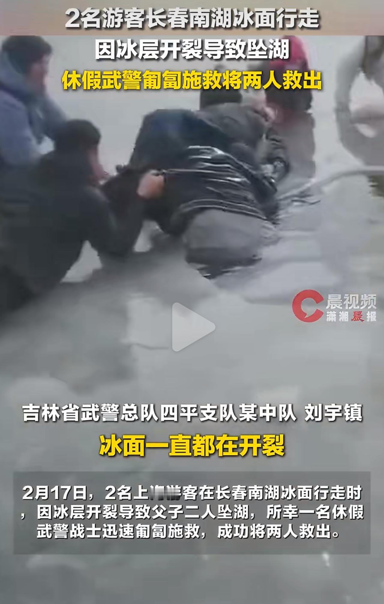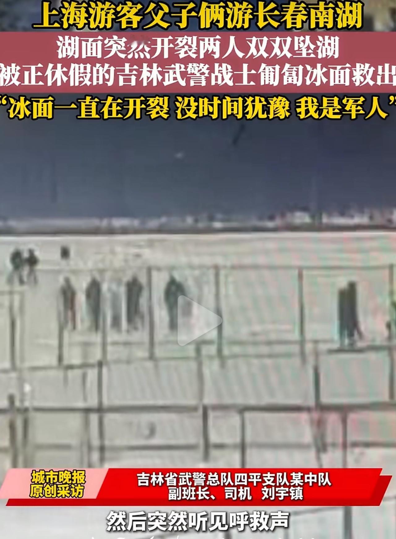 长春南湖这对从上海来的父子,就是在非开放区的冰面上走,没想到冰面突然就裂了,两个人直接掉进冰冷的湖里。当时湖水冻得人四肢瞬间发麻,根本没法自救,心里肯定又怕又慌。 幸好当时有个武警战士正在休假,看到出事立刻冲过去救人。冰面一直在裂,他就趴在地上一点点往前挪,好几次自己也滑进冰水里,还是咬着牙把人往上托。 最后在周围游客的帮忙下,父子俩才算捡回一条命。 真的要提醒大家,开春之后的冰面最坑人,表面看着硬,底下早就空了,积雪还把裂缝全盖住,一踩就塌。 最近因为踩野冰出事的新闻太多了,有人丢了命,有人差点回不来,可总有人觉得自己运气好。 平安真的不是靠英雄来救,而是自己别去碰危险。别为了拍两张照片、图一时新鲜,拿全家人的安心去赌。远离野冰,守住底线,比什么都重要。长春南湖 坠湖 野冰