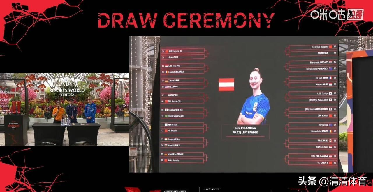 2026WTT新加坡大满贯女单正赛签表: 1/8区:孙颖莎🇨🇳VSQ、黎明映🇸🇬VS萨马拉🇷🇴、单晓娜🇩🇪VS张安🇺🇸、QVS石洵瑶🇨🇳 2/8区:早田希娜🇯🇵VS高桥布鲁纳🇧🇷、叶伊恬(中国台北)VS何卓佳🇨🇳、阿库拉🇮🇳VS赫尔希🏴、考夫蔓🇩🇪VS蒯曼🇨🇳 3/8区:陈幸同🇨🇳VSQ、阿尔霍达比🇪🇬VS康斯坦丁妮🇦🇺、袁嘉楠🇫🇷VS杨晓馨🇲🇨、李恩慧🇰🇷VS长崎美柚🇯🇵 4/8区:桥本帆乃香🇯🇵VS覃予萱🇨🇳、刘杨子🇦🇺VS斯佐科斯🇷🇴、张默🇨🇦VS舒麟茜🇸🇬、波尔卡诺娃🇦🇹VS陈熠🇨🇳 5/8区:王艺迪🇨🇳VS朱芊曦🇰🇷、QVS杜凯琹🇭🇰、QVS陈昭澐🇸🇬、金娜英🇰🇷伊藤美诚🇯🇵 6/8区:温特🇩🇪VSQ、付玉🇵🇹VS池旼亨🇦🇺、QVS万远🇩🇪、巴特拉🇮🇳VS朱雨玲🇲🇴 7/8区:张本美和🇯🇵VS尼娜🇩🇪、梅谢芙🇪🇬VS汉娜高达🇪🇬、木原美悠🇯🇵VS迪亚兹🇵🇷、伯格斯特隆🇸🇪VS大藤沙月🇯🇵 8/8区:申裕斌🇰🇷VS邵杰妮🇵🇹、拉科瓦奇🇭🇷VSQ、郑怡静(中国台北)VS李昱谆(中国台北)、曾尖🇸🇬VS王曼昱🇨🇳
