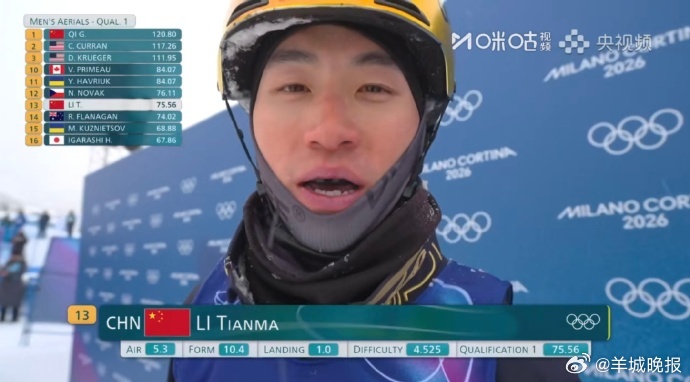 【#李天马第一跳75.56分#】米兰冬奥会自由式滑雪男子空中技巧预赛,李天马第17位出场,第一跳落地失误获得75.56分,第二跳加油!#每一位中国冰雪健儿都闪闪发光##谷爱凌赌上职业生涯的一跳##日本冰壶美女撞脸孙燕姿##宁忠岩绝杀时刻各国解说员都疯了#(咪咕体育) (编辑:郑宗敏;审签:谢杨柳)