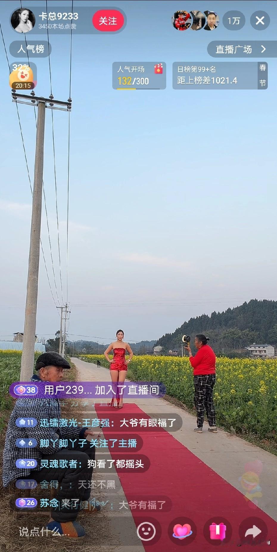 坐凳子的大爷是唯一观众,大妈做摄影,远处一只小狗在观望,婀娜多姿的女主走步,春节期间这种直播形式有很多人看。在线观看人数一万加,礼物不断的在刷屏,有红毯也有油菜花,整个氛围都是非常喜庆的。直播间看了一会,有热情观众,也有各种互动环节,从多方面角度来说这种直播方式可取的,也能带来情绪价值。 (图片来源于网络) 直播间瞬间拍照