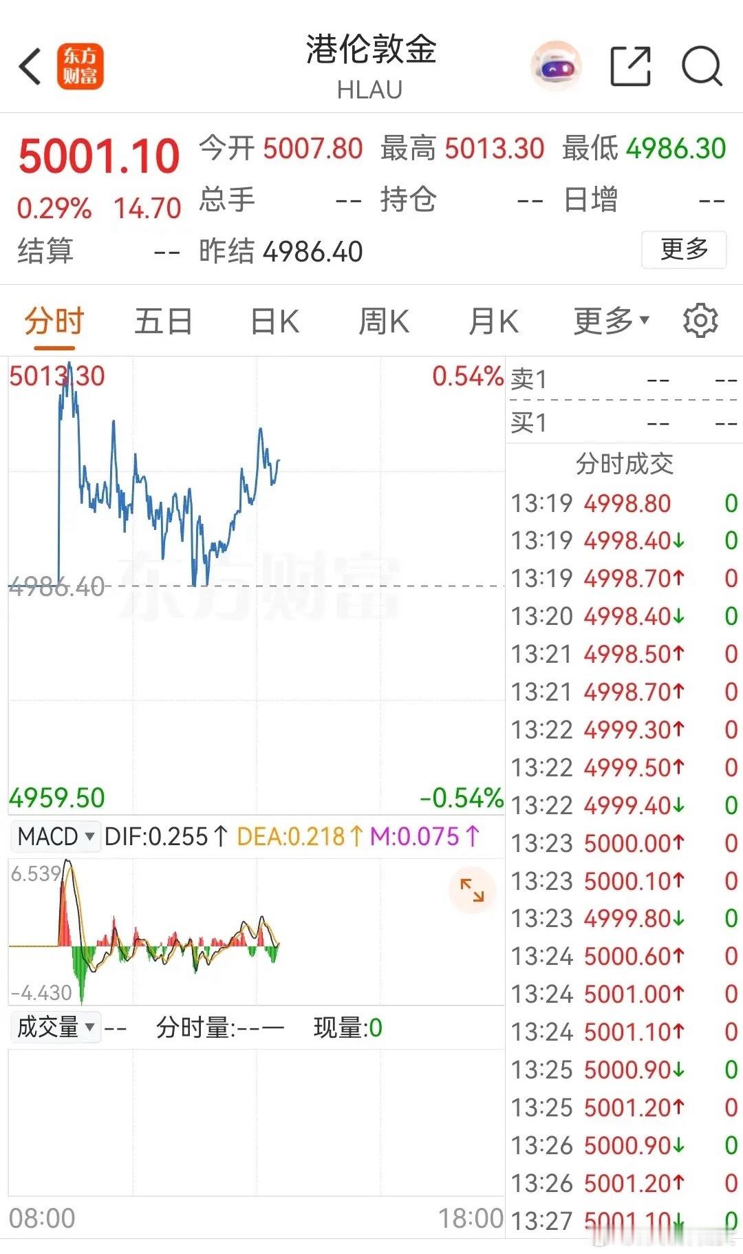 下面看看黄金的走势情况,目前港伦敦金高开后探底回升,涨了0.3%,报价为5001美元/盎司;COMEX黄金同样也是高开后探底回升,目前涨幅为0.4%,报价为 5019美元/盎司 。从今天的盘面走势上看,目前并没有大的波动,等会看晚上的走势情况吧!(13:27)