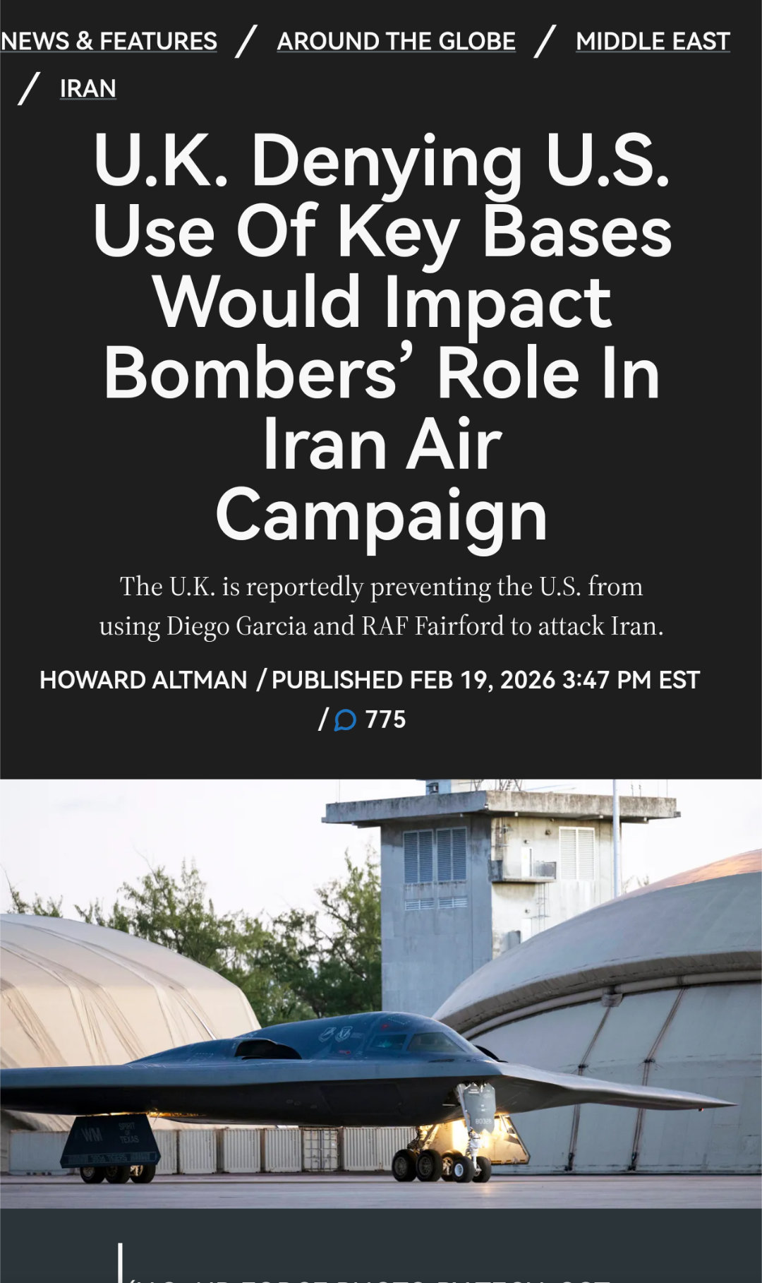 TWZ报道,由于英国对打击伊朗的法律担忧,以及特朗普和斯塔默在迪戈加西亚岛最终归属问题上的争执,英国拒绝美国在空袭中使用迪戈加西亚的空军基地,以及位于英国的费尔福德空军基地。热点观点烽火问鼎计划
