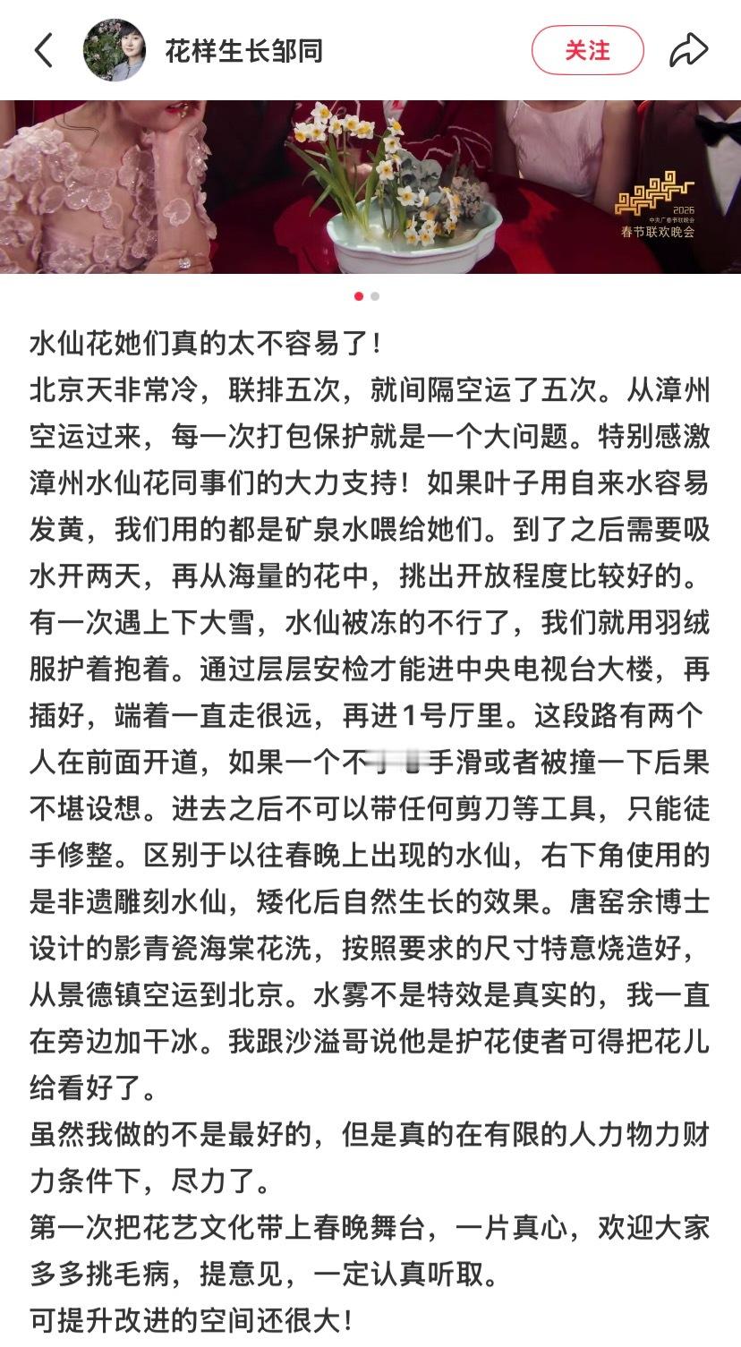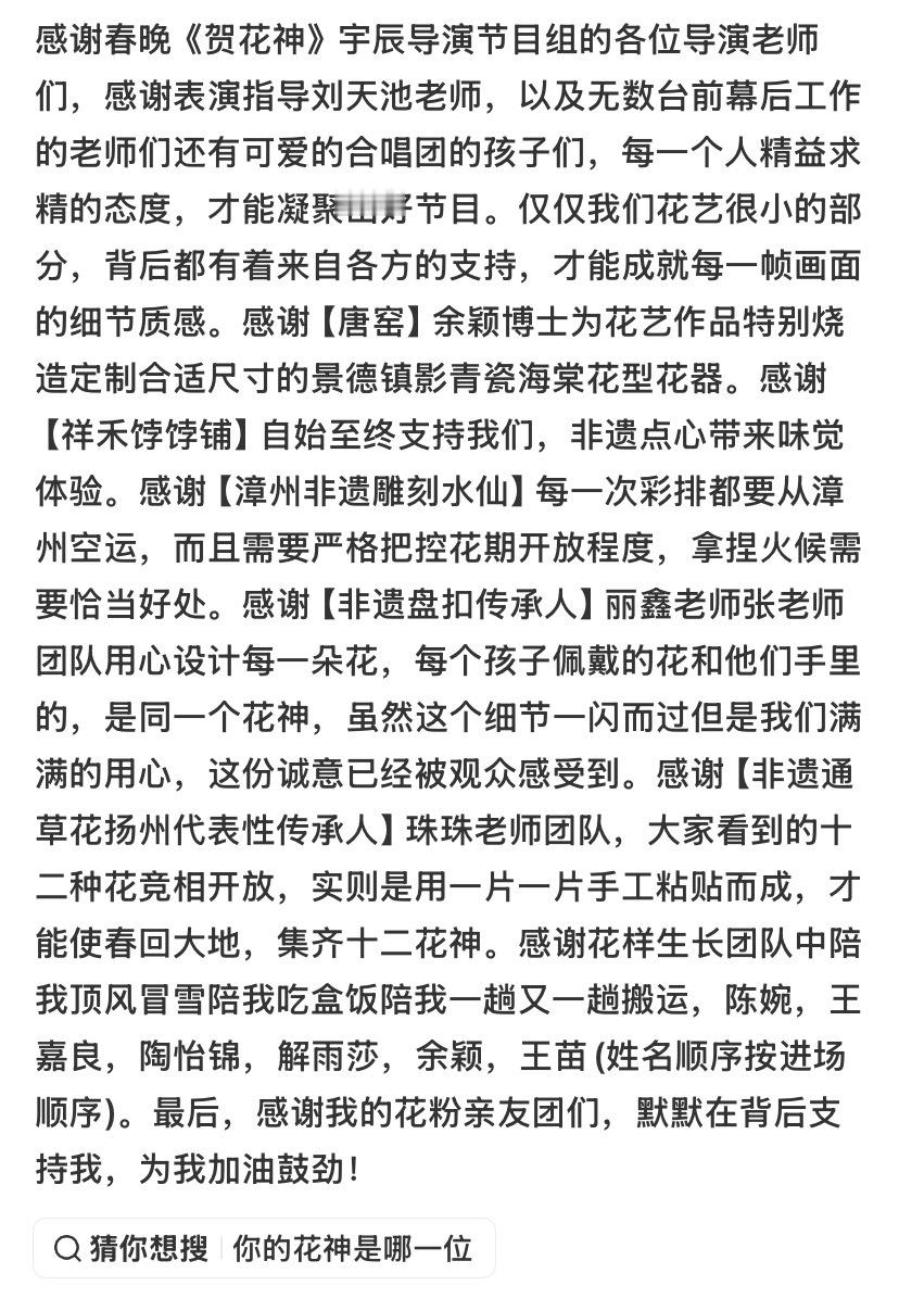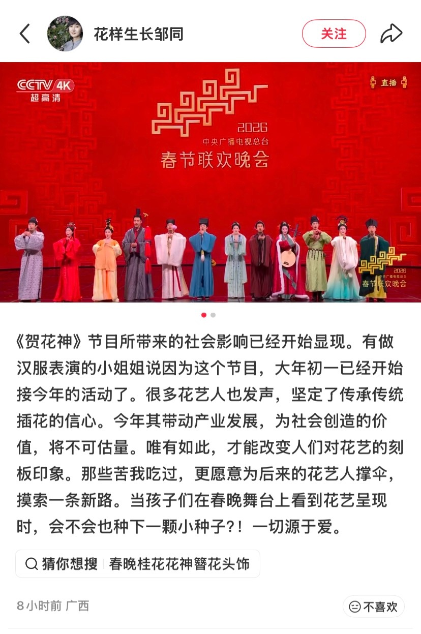 “《贺花神》节目所带来的社会影响已经开始显现。有做汉服表演的小姐姐说因为这个节目,大年初一已经开始接今年的活动了。很多花艺人也发声,坚定了传承传统插花的信心。今年其带动产业发展,为社会创造的价值,将不可估量。唯有如此,才能改变人们对花艺的刻板印象。”