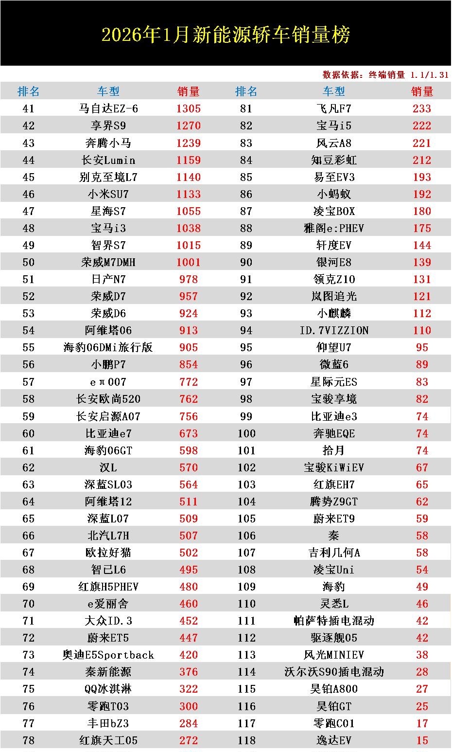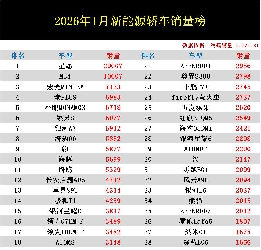新能源轿车销量腰斩,不是卖不动了,是大家开始挑着买了。 星愿卖了快三万辆,MG4也破万,但以前每月都上万的宏光MINIEV、秦PLUS、海鸥,这个月直接掉到五千多、六千多。 不是没人买车,是买的人越来越清楚自己要啥了。 乘联会数据说,2026年1月新能源轿车批发总量还在二十多万台,比亚迪一家就占了二十万出头,鸿蒙智行五万七,小米交了三万九。 数字没崩,但榜单变薄了——上个月还能排进前十的十来款车,这个月全不见了。 冷的是中低价走量车,热的反而是享界S9、小鹏P7+这些两三千台起步的高端纯电。 政策真变了。购置税减免2026年起取消,好多本来打算赶末班车的人,卡在了年初观望。 报废换新补贴细则一直没落地,想换车的老车主干脆不动作。 插混车型销量同比掉了35%,比纯电还猛,说明大家不再为“带点电”买单,只认真续航、真快充、真好开。 燃油车反而活过来了。吉利星瑞卖了一万九,逸动卖了一万三,比一堆新能源轿车还高。 不是大家又爱烧油了,是这些车现在也能语音、能大屏、能自适应巡航,关键是不用找桩、不用等充。 小米SU7虽然没进轿车销量前十,但YU7在SUV榜排第五,说明他们没死磕轿车,而是哪能卖就往哪铺。 比亚迪海豹06和秦L各卖五千八,加起来过万,但不再是靠一款车扛大旗,而是平台化出货。 丰田BZ5、日产N7加起来不到六百台,不是价格贵,是开起来像“电动拖拉机”,用户试完就不想再提。 星愿卖得好,不是因为便宜,是它有8155芯片、L2辅助驾驶,跑高速不累,市区代步不焦虑。 MG4破万,靠的是欧洲认证、后驱纯电、底盘扎实,出口订单反哺国内热度。 反倒是汉L、深蓝L07,参数不差,配置拉满,月销却只有两位数,没人记得住它到底是干啥的。 这波冷,冷得挺实在。 补贴没了,嘴上喊智能的人少了,真开车上路的人多了。 市场没死,只是把那些糊弄人的车, quietly刷掉了。 销量榜瘦了,可看的人更认真了。