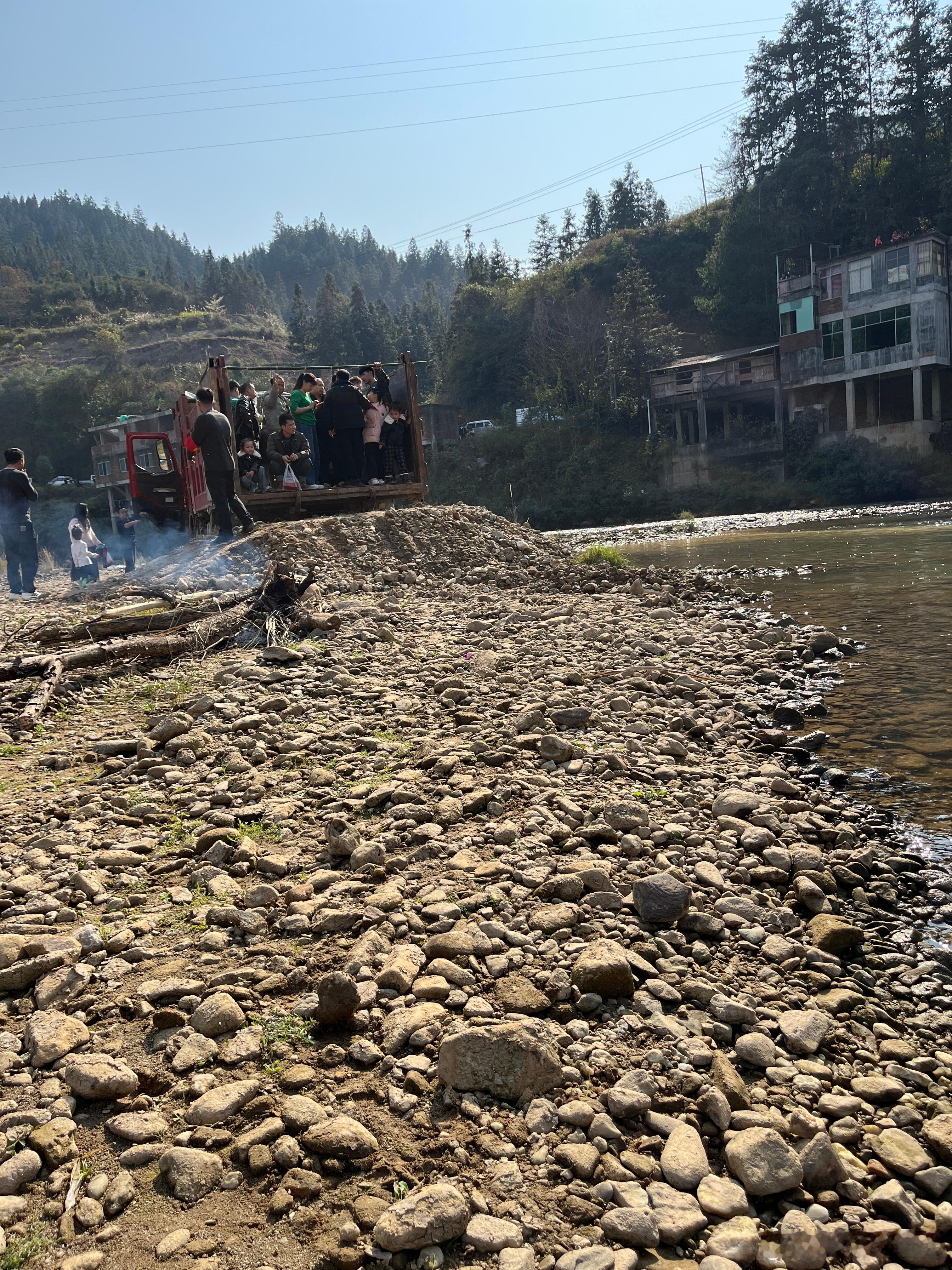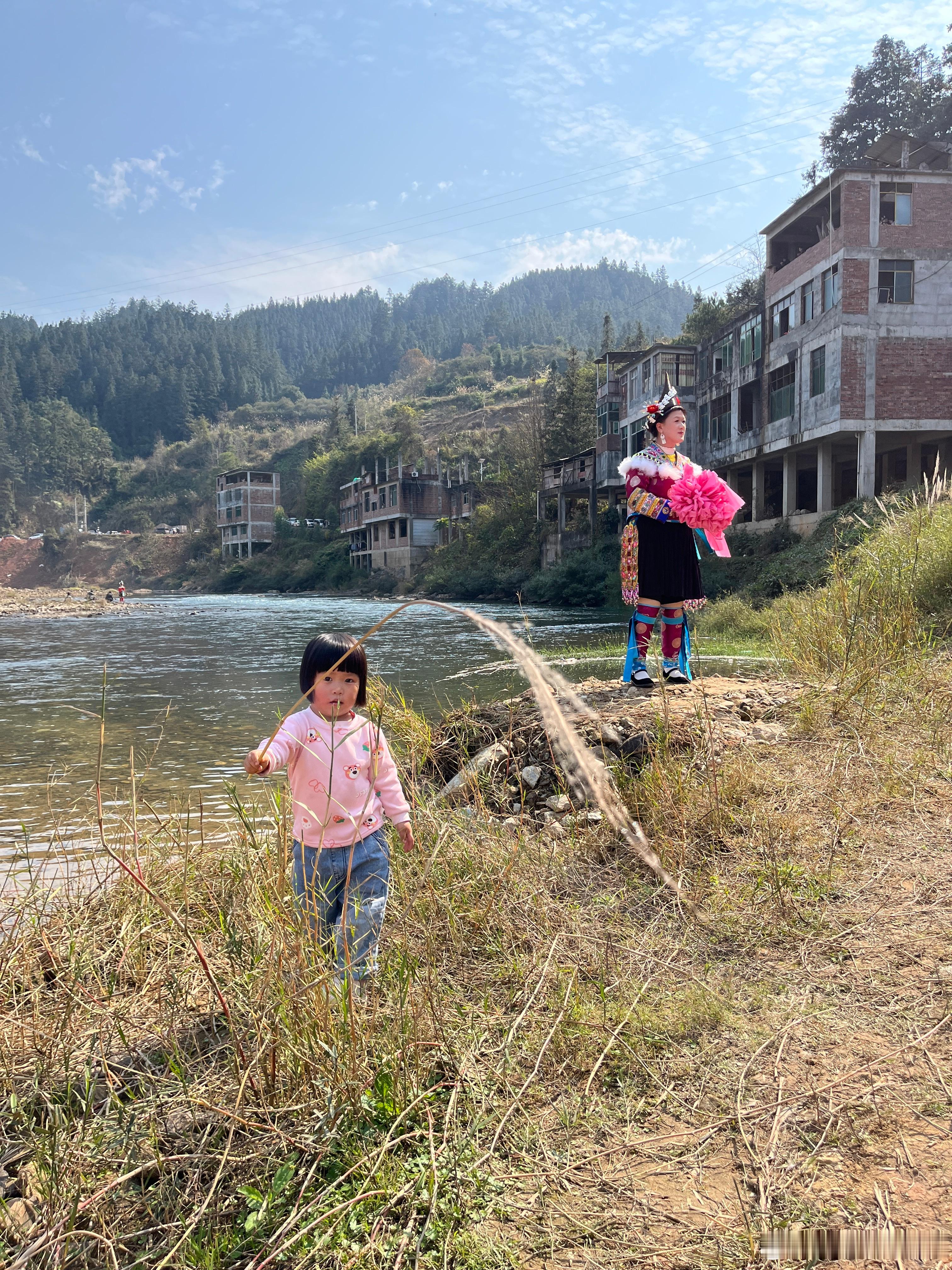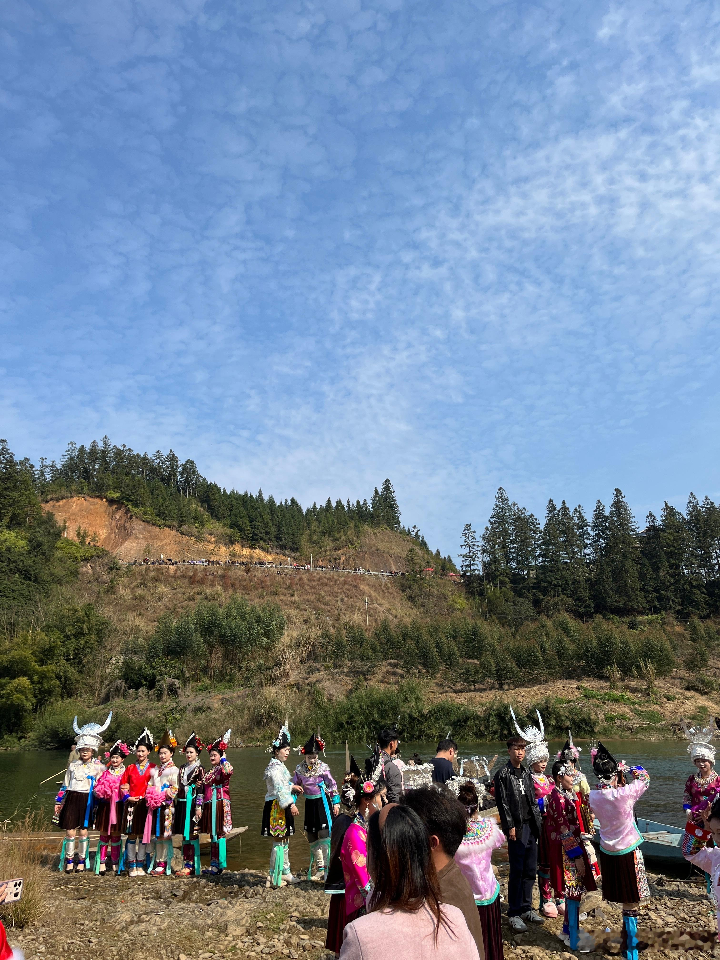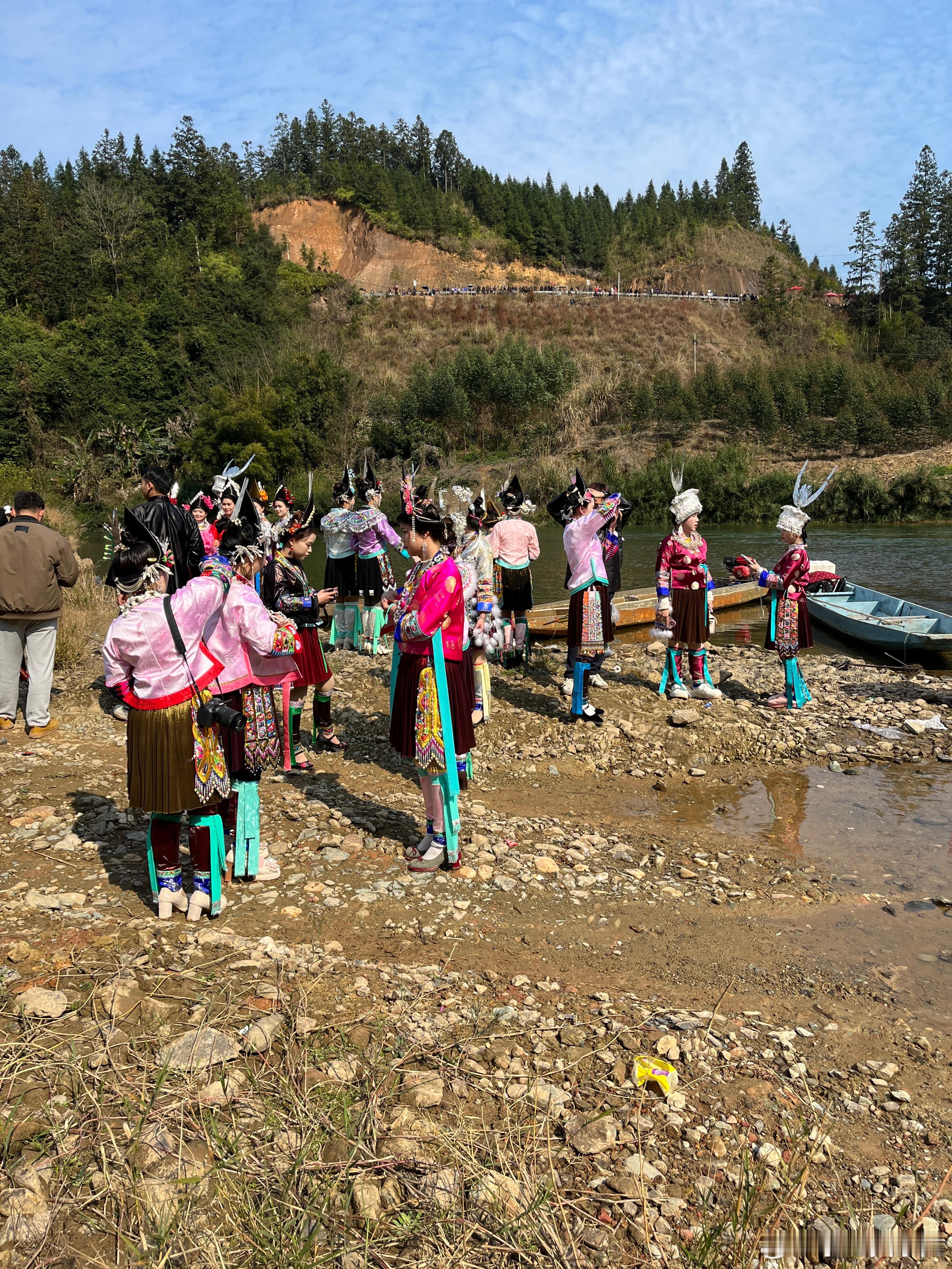 苗族的衣服很好看,都是美女,载歌载舞,她们表演完节目,就来河边拍照。