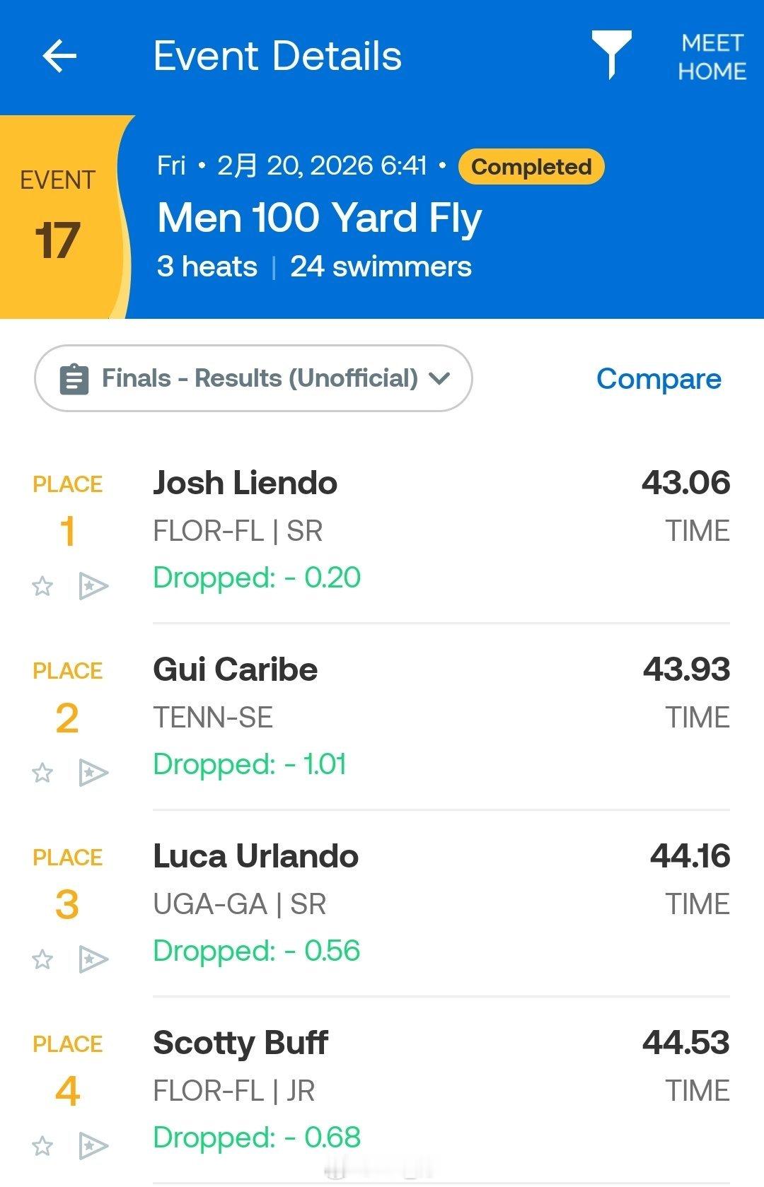 SEC Championships 25米短池世界纪录保持者Josh Liendo在今早25码池子游出43.06的历史第二快成绩!下个月有没有可能把奇葩的纪录拿下?