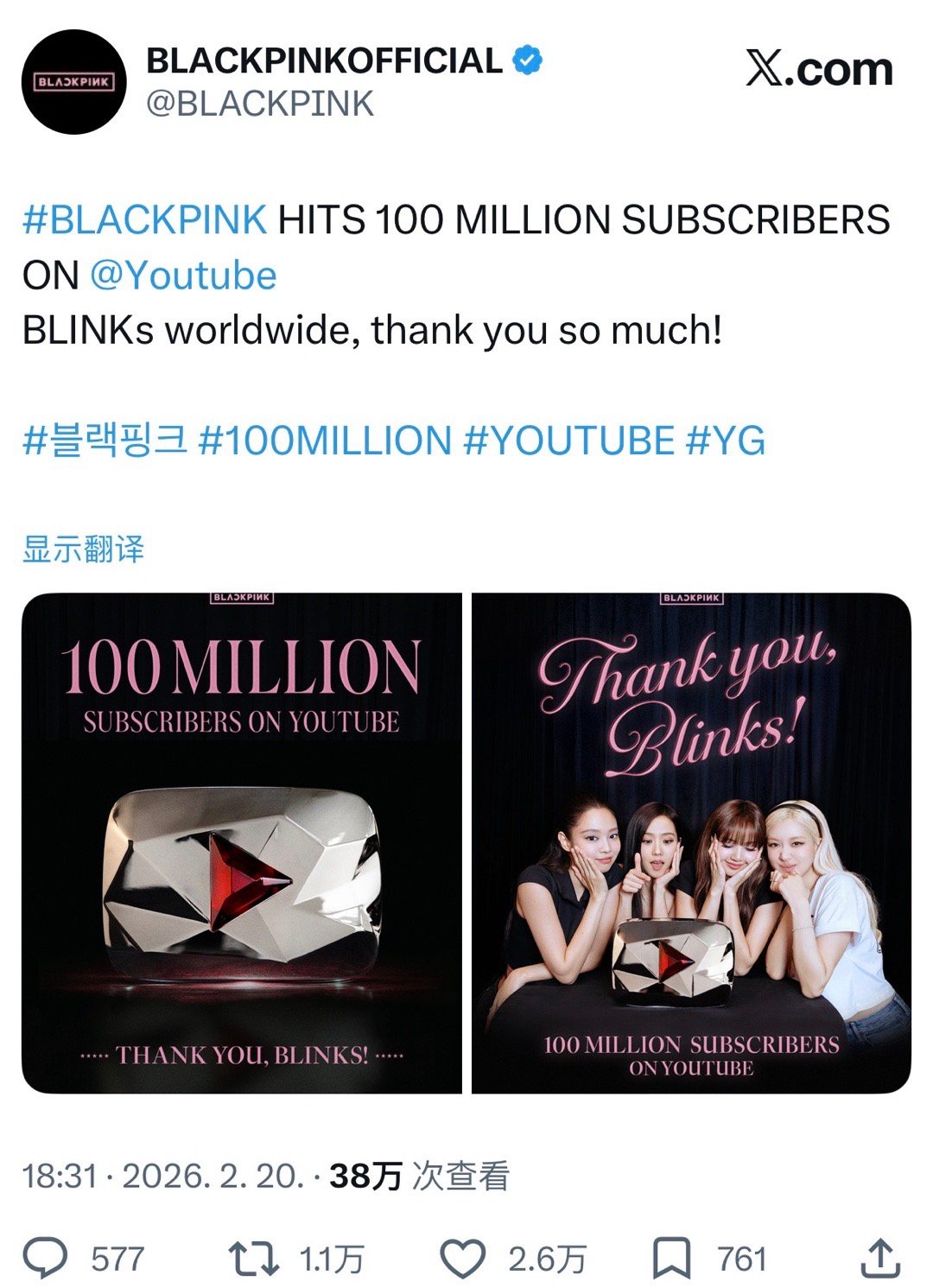 BLACKPINK油管粉丝数2016 vs 2026p1 2016/6/29 开通账号p2 2016/9/12 达成100万关注p3 2018/7/25 达成1000万关注p4-6 今天达成1亿关注(全球艺人中史上最初)👏总视频数648个总播放量411亿次