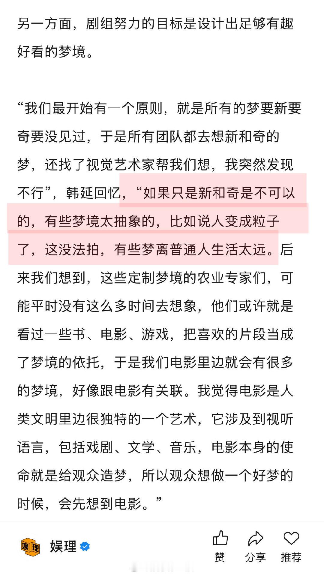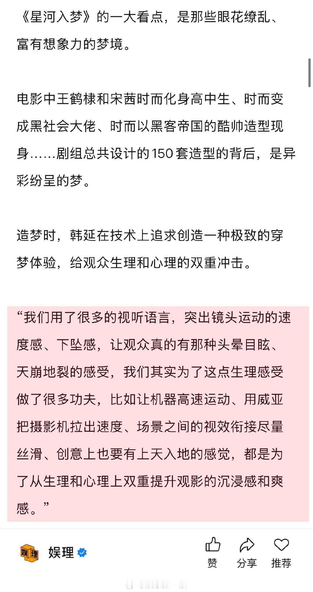 导演说王鹤棣宋茜是战友情 星河入梦导演说王鹤棣有使不完的劲 据导演韩延透露,《星河入梦》还拍了古装梦境,但剪辑阶段都删掉了,“要么是视觉有重复感,要么是色彩不够斑斓,要么就是让风格有点往下掉,我就把那些都忍痛割爱给删掉了,其实那些梦境我们都做完了,最后至少得删掉了一半的梦。”娱理独家↓