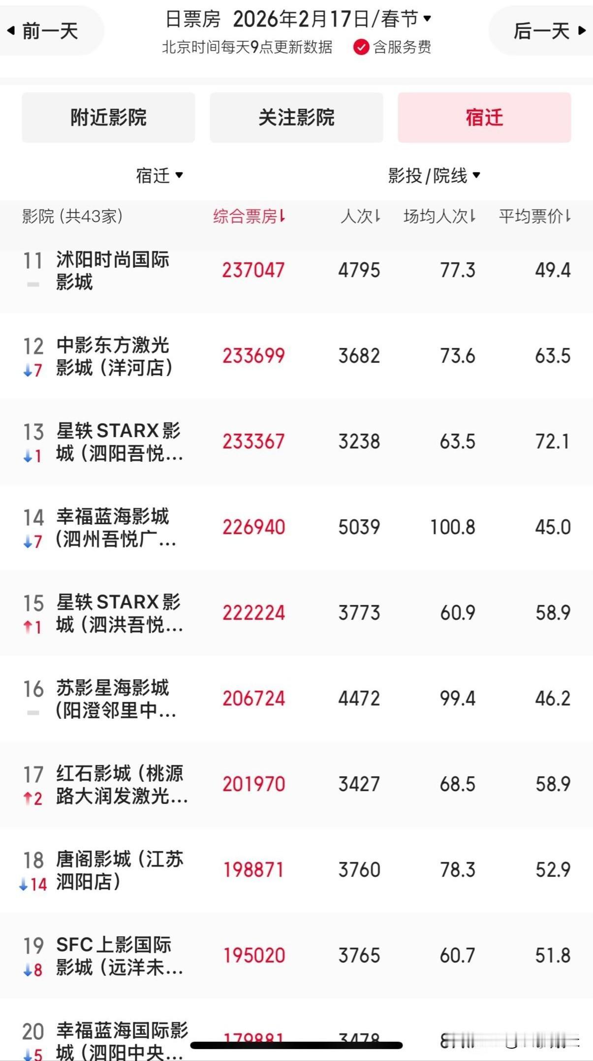 宿迁市各区县大年初一的票房成绩新鲜出炉,宿豫区万达的霸主地位依旧难以撼动。排名第2、3、4位的均被沭阳的影院占据,宿城区的五家影院则占据了第5、6、7、8、9名。 排名11 - 20的竞争也愈发激烈。颇为意外的是,大年初一当天,洋河新区综合票房以微弱优势超越泗阳吾悦、泗州吾悦、泗洪吾悦三座星轶影院,位居第12位。苏宿园区虽然人口较少,但也紧紧咬住两泗的三座星轶影院,排在第16位! 市区未来广场在首个春节档首日表现平平,位列第十九。